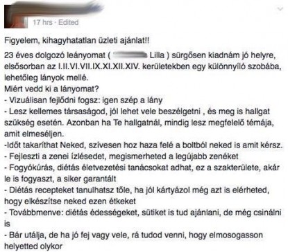 Egy régebbi és egy újabb keletű albérlettel kapcsolatos hirdetés jött szembe. Mindkét esetben egy-egy anyuka az elkövető. Hogy a jószándékon túl vajon csak a humor vezérelte-e őket, vagy meggondolatlanul fogalmaztak, döntsék el önök. Bár az egyediséget kedveljük, mi óvva intünk mindenkit a hasonló tartalmaktól…