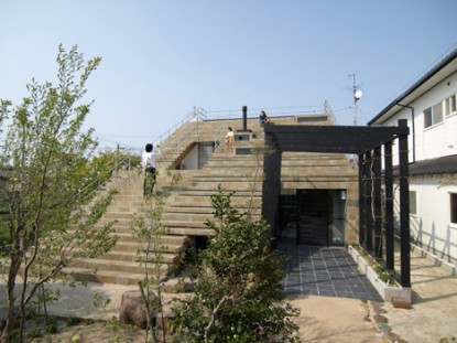 Az y+m japán tervezőiroda igazán vonzó házat tervezett. A lakórész egésze egy hatalmas lépcső alatt húzódik meg. A ház külső felülete így akár házi színielőadásokra, koncertekre is használható, de könnyen válhat belőle spontán közösségi tér, gyülekező hely.