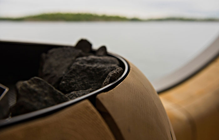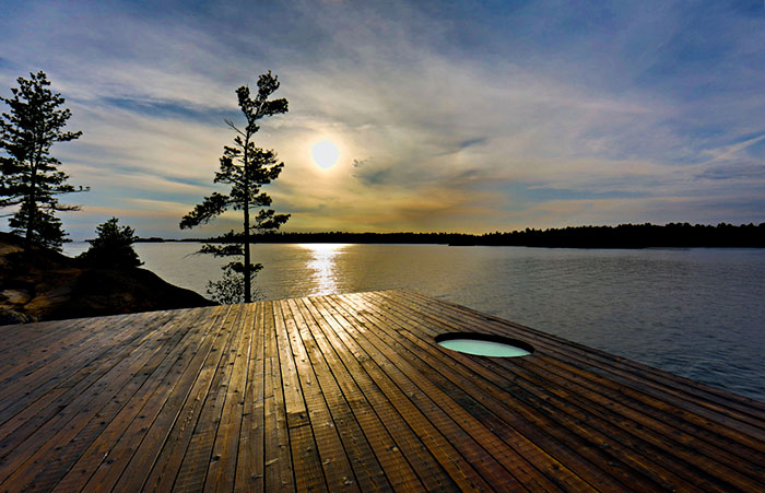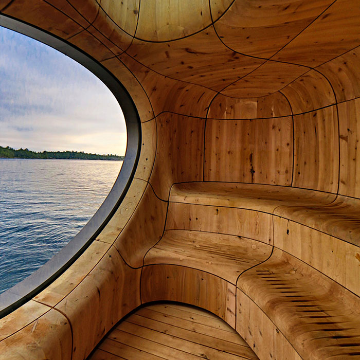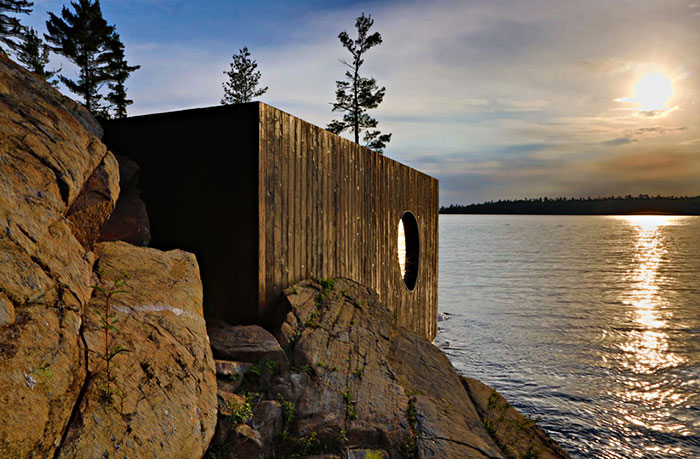 A Partisans építész iroda által tervezett szépség egy privát kis szigeten található Torontó közelében. A szauna építőelemeit egyébként már előre legyártották, majd hajón szállították a szigetre és a helyszínen rakták össze. Elég szép kis LEGO kunyhó lett belőle.