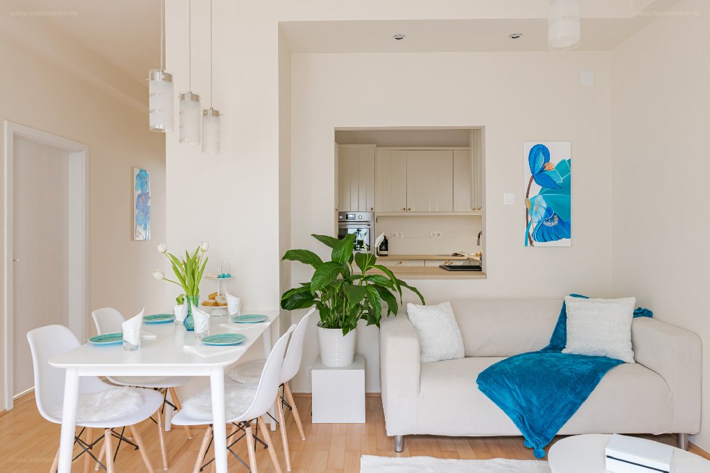 A puha, kuckós kiegészítők révén a lakás jelenleg a mediterrán tengerpartok életörömét idéző kék-fehér színekben pompázik. Ez azonban nem szab határt az új Tulajdonos kreativitásának, hiszen a tisztaságot, nyugalmat sugárzó felületekre átalakítás nélkül álmodhat bármilyen új stílust, szín- és formavilágot.