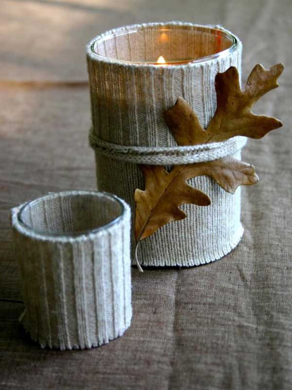 Hangulatos gyertyatartó. Hozzávalók egy pohár, egy elnyűtt pulóver vagy harisnya és egy falevél…