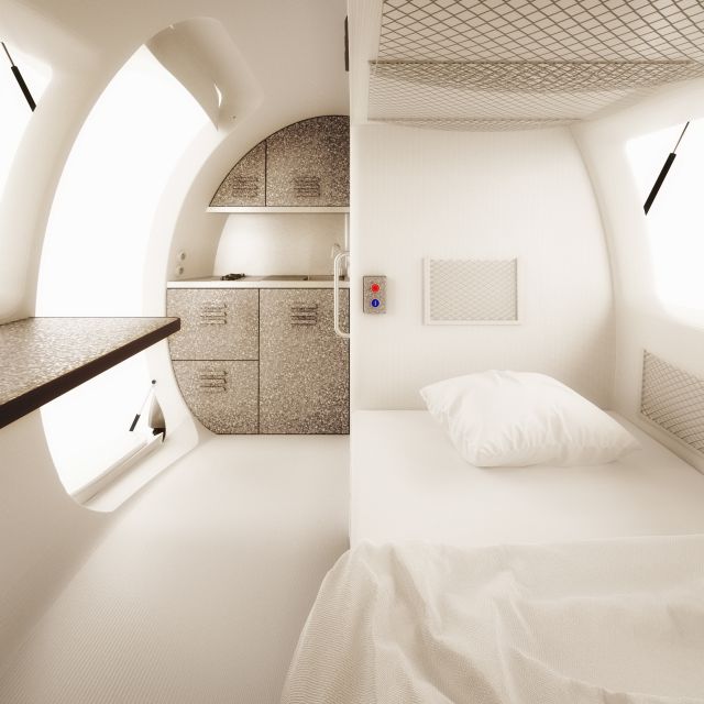 A fekhelyen felül beépített folyóvízzel ellátott mini konyha, lehúzható WC és forró zuhany is várja a beköltözni vágyókat. Képzelje csak el, ledob egy ilyen kapszulát a vadon közepén, mégis európai körülmények között élhet!