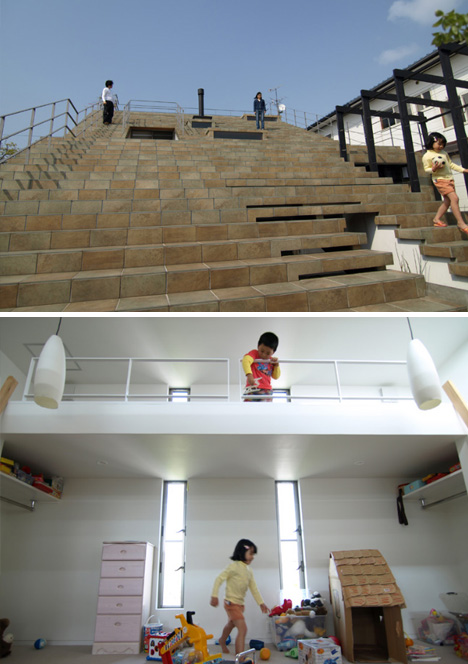 Az y+m japán tervezőiroda igazán vonzó házat tervezett. A lakórész egésze egy hatalmas lépcső alatt húzódik meg. A ház külső felülete így akár házi színielőadásokra, koncertekre is használható, de könnyen válhat belőle spontán közösségi tér, gyülekező hely.