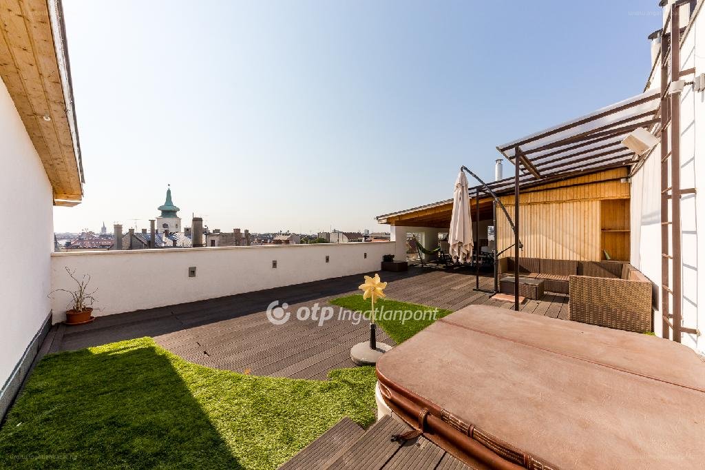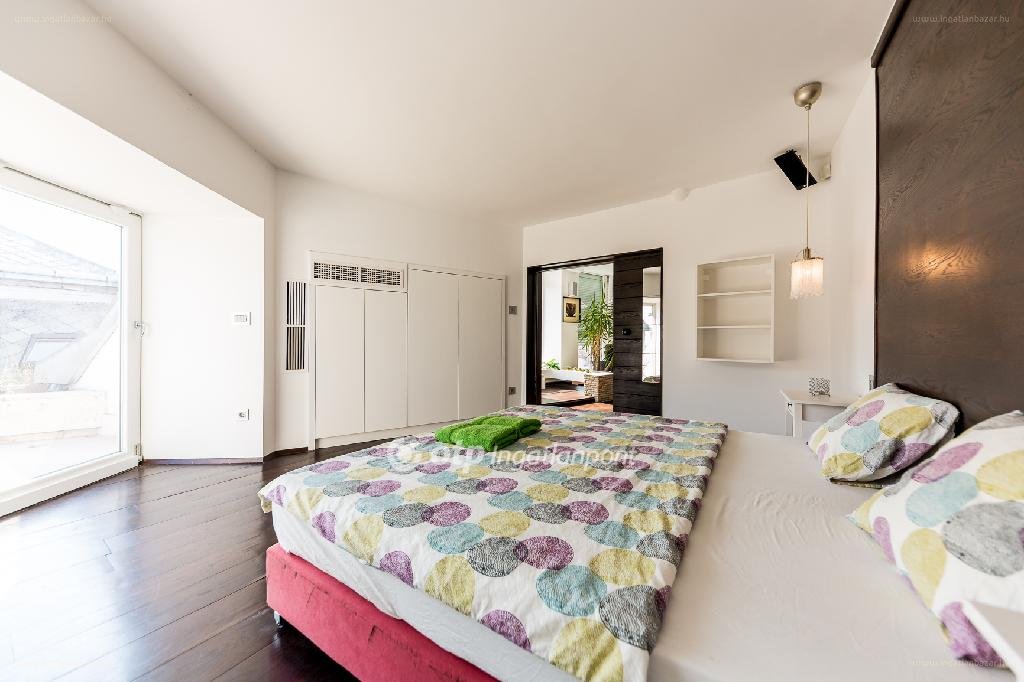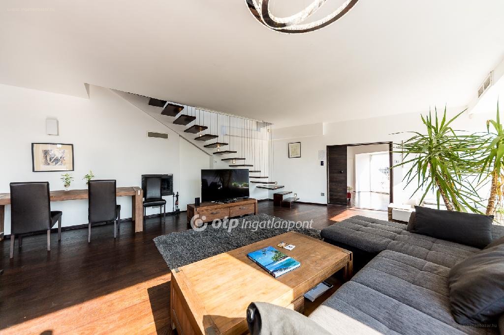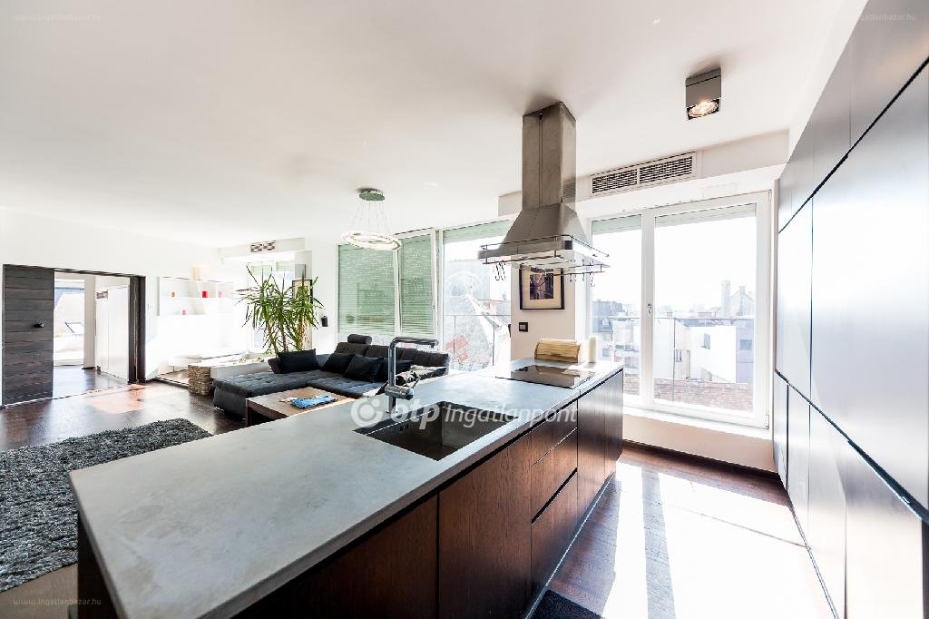 „Kivételes körpanorámás penthouse a Belvárosban!!!!!!!! A belváros frekventált részén az Egyetem térhez közel található társasház legfelső emeletén található 4 lakást együtt kínáljuk értékesítésre, ezek jelen állapotban egy 222 m2 + 85 m2 terasz kialakítású attraktív penthouse, valamint három kisebb lakás – 40-30-15 m2-es garzon , de a lakások akár egybenyithatóak, a terek alakíthatóak. Az alsó szinten egy 55 m2-es nappali-étkező-konyhát, egy 20 m2-es hálót, 11 m2-es teraszt találunk, valamint a legmodernebb design fürdőt ill. gardróbot.