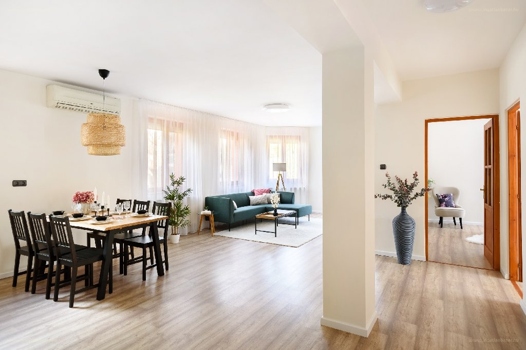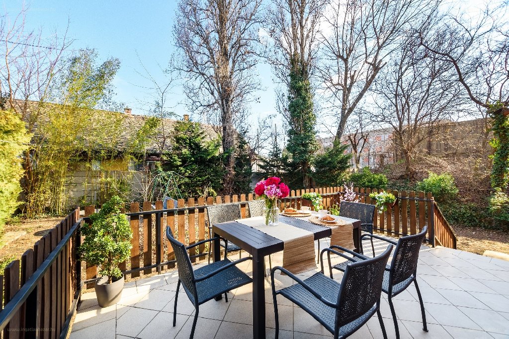 “Az ingatlan a XX. kerületi Erzsébetfalván csendes, szép családiházas zsákutcában, a központtól 5 percre, nyugodt környezetben található. A 2002-ben épült, 4 lakásos társasházban, frissen felújított magasföldszinti, lakberendező által berendezett, KLÍMÁS, hatalmas amerikai konyhás nappali + HÁROM hálószobás, fürdőszobás, 2 wc-s, 13,8 m2 madárcsicsergős teraszos, 192 m2 kertkapcsolatos, világos, riasztóval ellátott 93 m2-es lakás eladó, amely 2 beállós mélygarázzsal és egy hatalmas 11 m2 tárolóval is rendelkezik. Az Erzsébetfalván álló lakás azonnal költözhető, 1/1 tulajdonú, tehermentes!