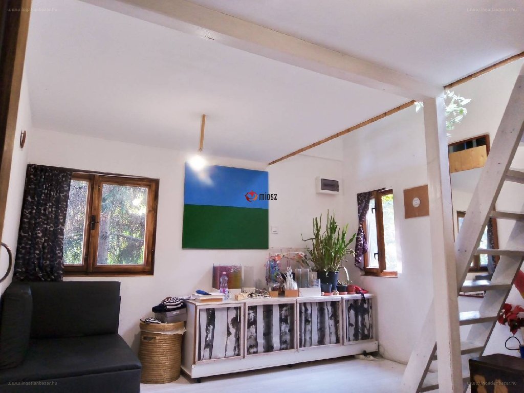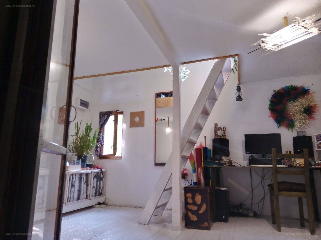 Az alsó szinten előszoba (7,5m2), konyha (8,75m2), nappali (16,45m2), fürdő+WC (3m2), a felső szinten pedig egy 19,5 nm-es szoba került kialakításra. A statikus által stabilnak ítélt, kiemelt beton alapon fekvő épület szerkezetileg kiváló, külső faburkolata korához képest is jó állapotú, ázásmentes. A házban a közelmúltban teljeskörű belső felújítás során megtörtént az elektromos hálózat cseréje, az épület rétegközi szigetelést, a konyha design elemként látszó-OSB borítást, míg a többi helyiség tűzálló gipszkarton borítást és új, minőségi burkolatokat kapott. A ház villanyradiátorral költséghatékonyan kifűthető, ám inverteres klíma kiépítése is könnyen megoldható. A konyhában jelenleg gázpalackos tűzhely üzemel. Közművek közül villany és vezetékes víz kerültek bevezetésre, a szennyvíz jelenleg emésztőbe történik ám mind a gáz, mind a csatorna beveköthetők az utcáról. A ház mögött 2x2m alapterületű, önálló tároló kapott helyet.