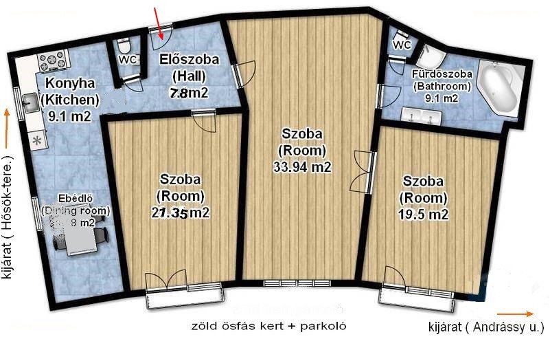 Az Andrássy úti ingatlanban 2 KÜLÖN NYÍLÓ HÁLÓSZOBA, egy NAPPALI, egy ÉTKEZŐS KONYHA, egy tágas fürdőszoba, egy külön WC és egy előszoba került kialakításra. A nappaliból nyíló hálókhoz tartozik egy-egy kertre néző FRANCIAERKÉLY is. A konyha villanytűzhellyel, elszívóval, mosógéppel, kombinált hűtővel és mikrohullámú sütővel felszerelt. A gránitburkolatos fürdőszobában egy HIDROMASSZÁZS SAROKKÁD és egy zuhanykabin is helyet kapott. Az előszobában és a konyhában lévő BEÉPÍTETT SZEKRÉNYEK remek tárolási alternatívaként szolgálnak. A délnyugati tájolású ablakok és az erkélyek a ház hátsó, gondozott, zöld, ősfás kertjére néznek, így a lakás a Hősök tere közelségének ellenére is kifejezetten csendes, a fürdőszoba pedig lichthofra nyílik, ennek köszönhetően ez a helyiség is világos és jól szellőztethető.