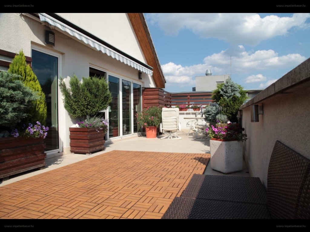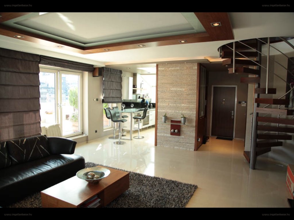 A legfelső, 6. emeleti, kétszintes lakás 2011-ben luxus minőségben lett felújítva a Rendőr-főkapitányság közelében. Az alsó szinten nappali, amerikai konyha+étkező, vendég WC, előszoba, szélfogó és egy 37m2-es terasz található. A felső szinten 3 szoba, közlekedő, 2 kis erkély és a fürdőszoba került elhelyezésre. Ház központi fűtés egyedi hőmennyiség méréssel, alsó szinten padlófűtés, felső szinten radiátorok.”