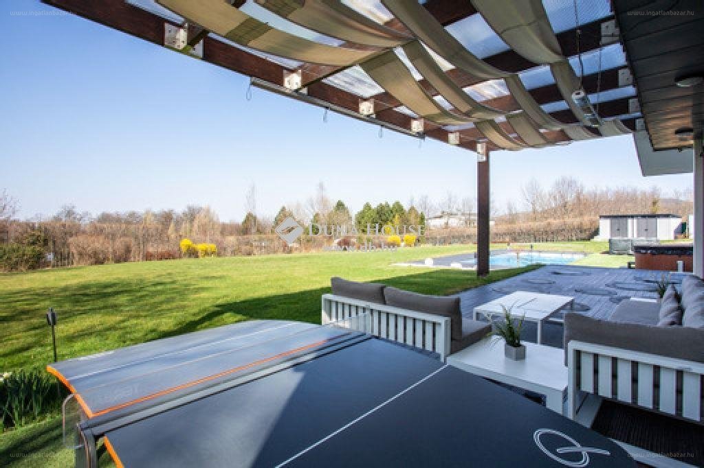 „A Páty külterületén található ingatlan rendelkezik külön borospincével szaunával kültéri medencével liftes tető terasszal kandallóval.Két szinten prémium anyagok felhasználásaval 5 hálószoba, 3 luxus fürdőszoba, gardróbszoba, mosószoba, nappali-konyha-étkező, egy atrium, kettō garázs és kültéri parkoló lett kialakitva. Elektromos zsaluzia arnyekolasra a nagyméretű nyílászárókra. A végig üveg felületű nappali, nyugati fekvésű, ahonnan csodálatos naplemente látható, Loxone applikácioról működtethető többek között a hűtés-fűtés, riasztó, kamera rendszer, terasz melegítő, terasz párologtató, világítás vezérlés, audio kezelés, árnyékolástechnika is.Gáz központi padlófűtés mellett, fali és mennyezeti hűtés fűtés van. Napelemes energiára kialakítható a tetőtér. Központi vizlágyito lett kialakítva az egész házban.