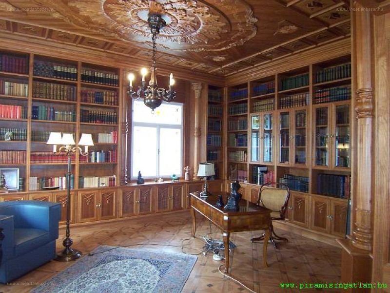 - félemelet 150 m2: előszoba, könyvtárszoba, nappali kandallóval, ebédlő, teraszok, konyha tároló, kamra. WC.; belmagasság: 3.50 m