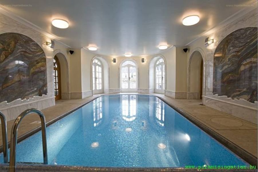 - Földszint 120 m2: uszoda 3,6×8,5m feszített víztükrű ellenáramoltatós üvegmozaik burkolatú medencével, infra szauna, finn szauna, gőzkabin, fürdőszoba, borozó kis konyhával, liftgépház, gépészeti helyiség-mosókonyha, személyzeti lakás.; belmagasság: 2.60 m