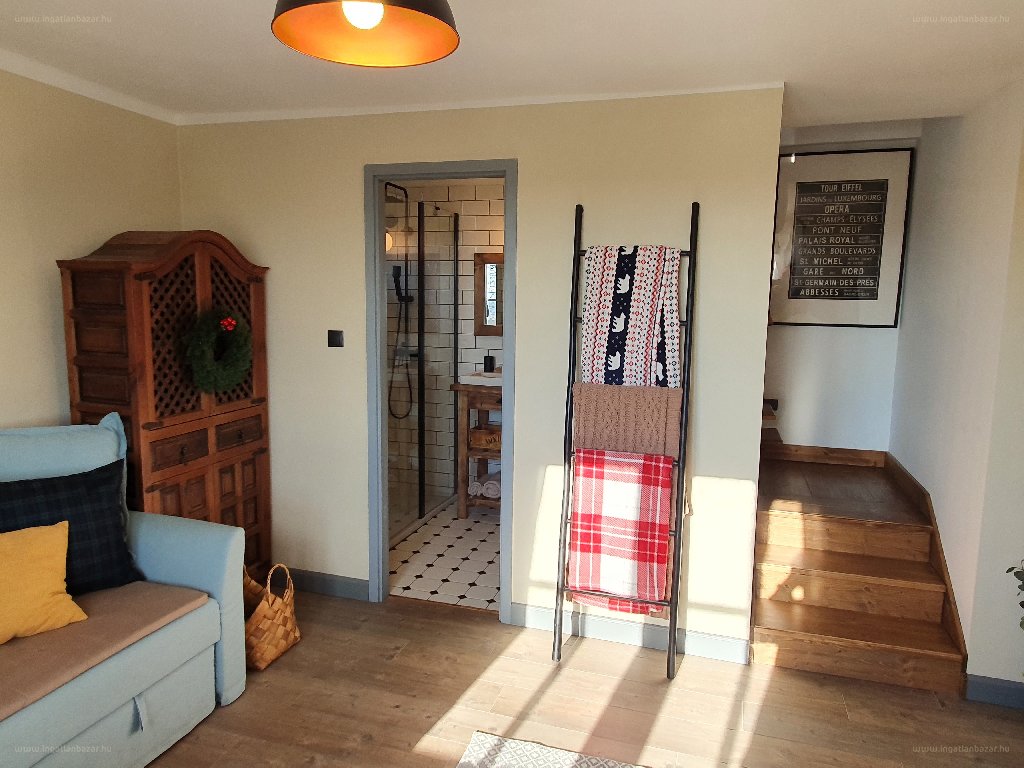 A két lakószint összesen 45nm-es, ahol a magasföldszinten egy konyha-étkező, egy nappali, Fürdő-WC és a lépcsőház, a tetőtérben pedig egy hálószoba található.