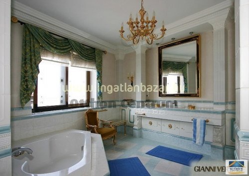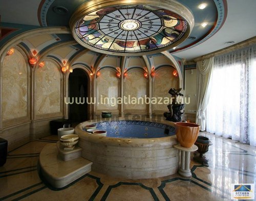 A ház 2001-ben épült, 5 szintes és 10 autó beállására szolgáló garázsrendszerrel is bír. Az erkélyek és teraszok mellett kiemelkedő a vizesblokk, amely „9 WC-vel, 2 tusolóval 4 fürdővel ellátott, és amelyekből 2 fürdő VERSACE (16nm/db) tervei alapján burkolt, szaniter beépítésű!”. A képen látható, minket törökfürdőre emlékeztető csoda tulajdonképpen egy 4 m széles, velencei üvegborítású jakuzzi, melynek kupolája hátul világító, ólombetétes, kézzel festett üvegből készült, míg falazata márvány és alabástrom. Pazar, nem? Ugyanitt infrakamra, multifunkciós gőzölős zuhanykabin is megtalálható.