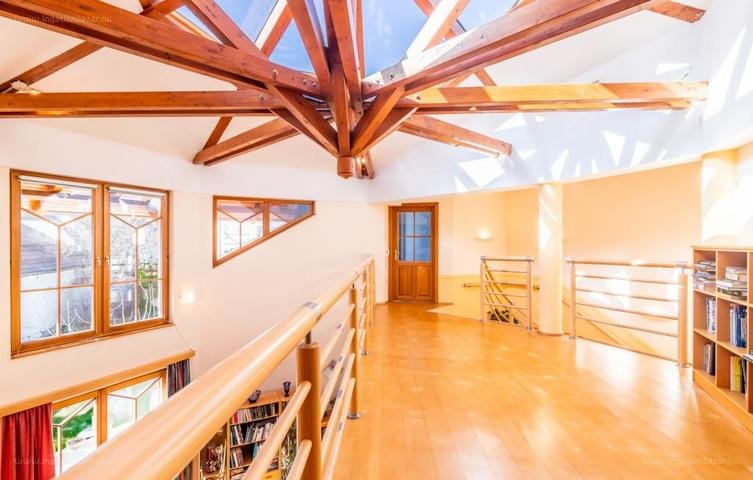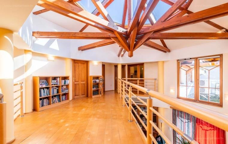 A rendkívül kreatív képzelőerővel megáldott tulajdonos álma valósult meg az impozáns látványt nyújtó családi ház megalkotásával. A mosonmagyaróvári épület 125 nm-es földszinti részén egy nagy nappali kapott helyet, kissé elkülönítve az étkező-konyhától, valamint egy hálószoba, gardróbszoba, háztartási helyiség, kényelmes méretű fürdőszoba található. A konyha magas minőségű, integrált , Miele típusú konyhagépekkel felszerelt. A nappaliból egy részben fedett teraszon keresztül juthatunk ki, a 175 nm területű intim hangulatú-automata öntözőrendszerrel is felszerelt – kis kertbe. A 86 nm-es tetőtéri részben található az impozáns galéria, 2 hálószoba, gardróbhelyiség, külön fürdőszoba és külön WC. Itt található a ház ékköve , a briliáns építészeti megoldással kialakított un.”kupolás kitekintő”