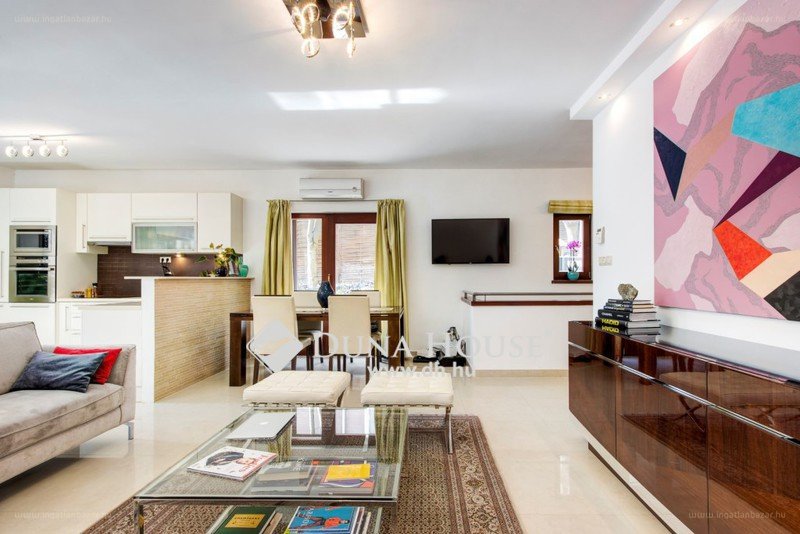 A Pasaréti térnél található lakás tereiben jelenlegi használat szerint így került kialakításra egy 15 nm-es gardrób, egy 9 nm-es dolgozórész a mellette álló 8 nm-es könyvtárszobával, egy zuhanyzós fürdővel ellátott, külön wc-vel rendelkező mellékhelyiség, és 20 nm-es moziterem/vendégszoba. Az 57.37 nm-es alsó szint egy ún. angolaknás ablakos megoldással biztosítja a helyiségek friss szellőzését, természetes fényét, amit az esti, vagy hidegebb téli napokban a jól kiépített belső világításrendszer egészít ki.A Pasaréti tér közeli lakás 88.9 nm-es fő szintjére belépve egy kádas fürdőszoba, két egyenértékű hálószoba mentén a hatalmas, amerikai konyhás, étkezős nappaliba érkezünk, ahol mindent beragyogó, déli tájolású napfény borít be télen-nyáron, és kijuthatunk a zöld fákkal körülölelt, kövezett, 200 nm-es kerthez.