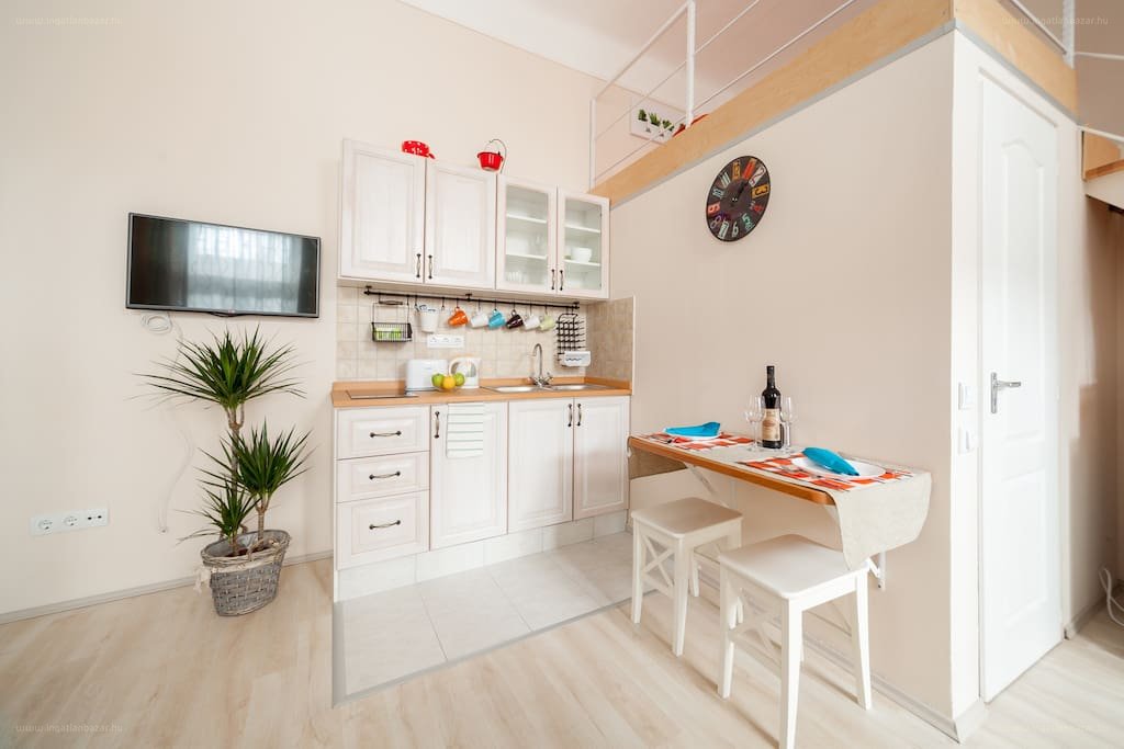 A nagyobb, színekkel feldobott lakás 3 külön bejáratú szobás! A nappali, ami szintén használható hálóként is, és az egyik hálószoba utcai, a másik háló udvari nézetű. Külön kis ablakos konyha, zuhanyozós fürdőszoba, külön kézmosós WC, és a közlekedőben étkező található. Cirkó fűtéses. A kisebbik lakás: 1 amerikai konyhás nappalis, plusz alvó galériás, zuhanyozós fürdőszobás. Elektromos fűtéses.”