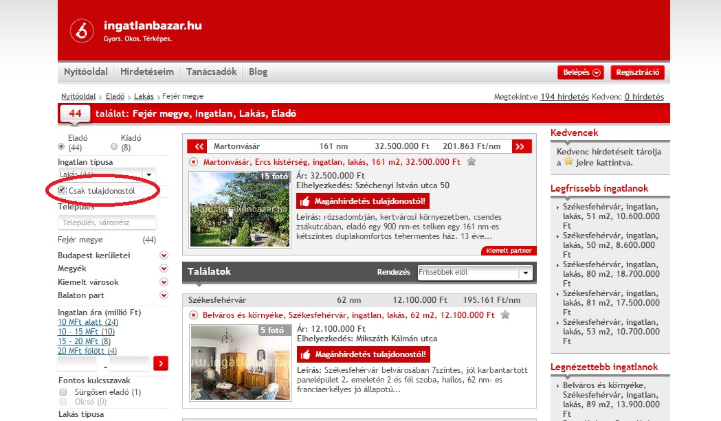 A felirat melletti kockát kipipálva a rendszer automatikusan kiszűri a magánhirdetői ingatlanokat, és innentől kezdve – a kiválasztás megszűntetéséig – már csak ezek jelennek meg a böngészés során.