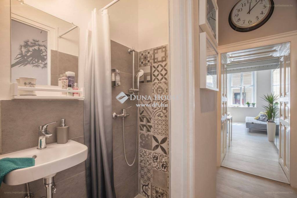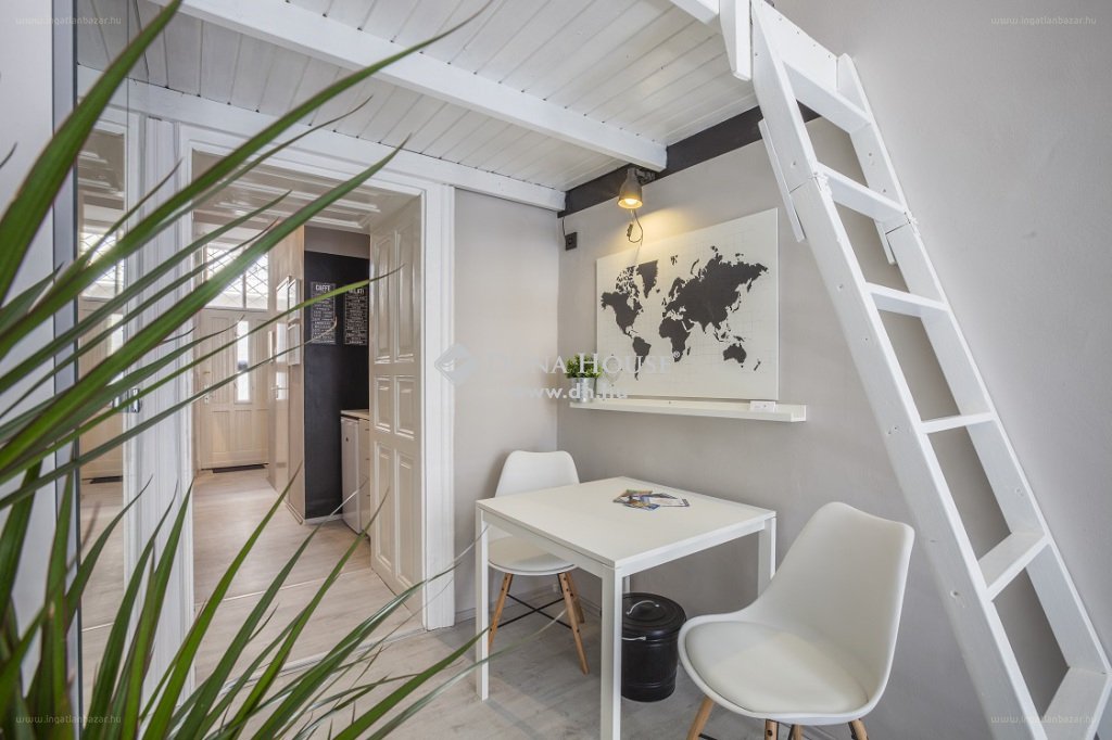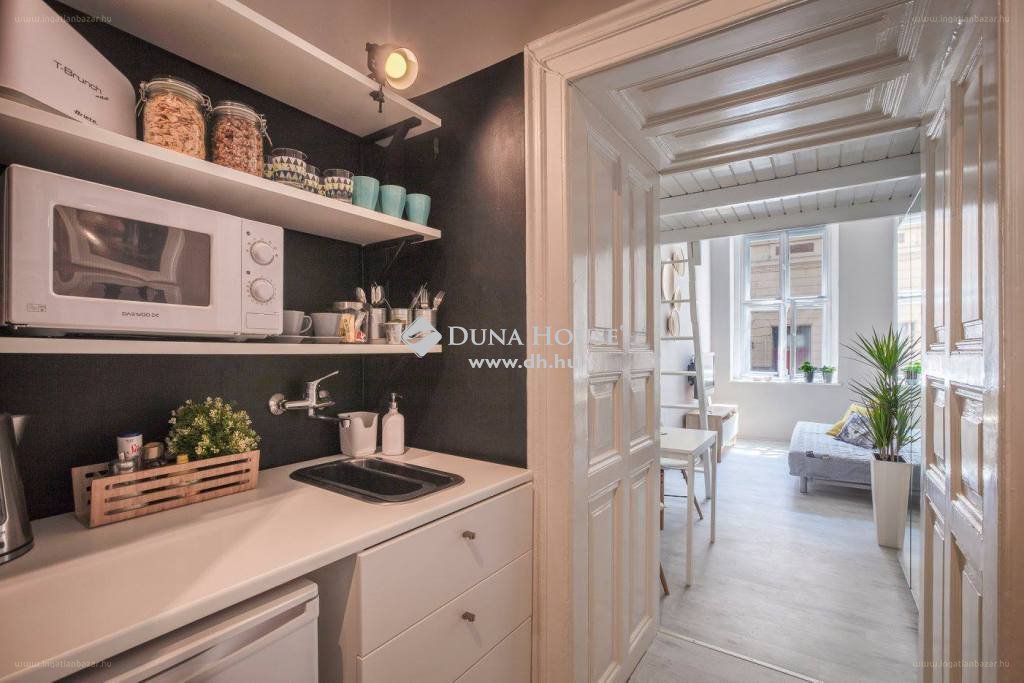 „Eladó a belváros szívében a VI. kerület Szondi utcában, gyönyörű zöld növényes udvarban egy 18m2 + galériás, felújított, bebútorozott utcai nézetű mini garzonlakás. A keskeny, de lakberendező által megálmodott, funkcionálisan elrendezett tér, és a lakás hangulata magáért beszél. A lakásban épített zuhany, nappali/étkező és tea konyha található. A fűtésről norvég Nobo elektromos panel gondoskodik. A vételár részét képezik a bútorok is.