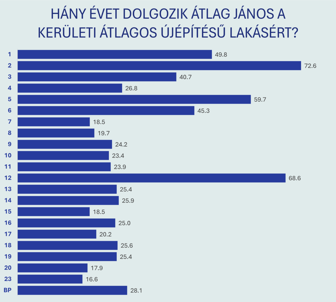 A kerületek között extrém különbségek vannak. Átlag János képzeletbeli honfitársunknak, aki épp a mediánbért keresi, a budai presztízs-kerületekben egy átlagos új lakás megvásárlásához 50–70 évnyi nettó jövedelmét kellene félretennie, míg a kevésbé felkapott pesti városrészekben ez „mindössze” 20–25 év. Elméletben a VII. és a XV. kerületben jutna leghamarabb újépítésű otthonhoz – ha feltételezzük, hogy a teljes fizetését lakhatásra tudja fordítani.
