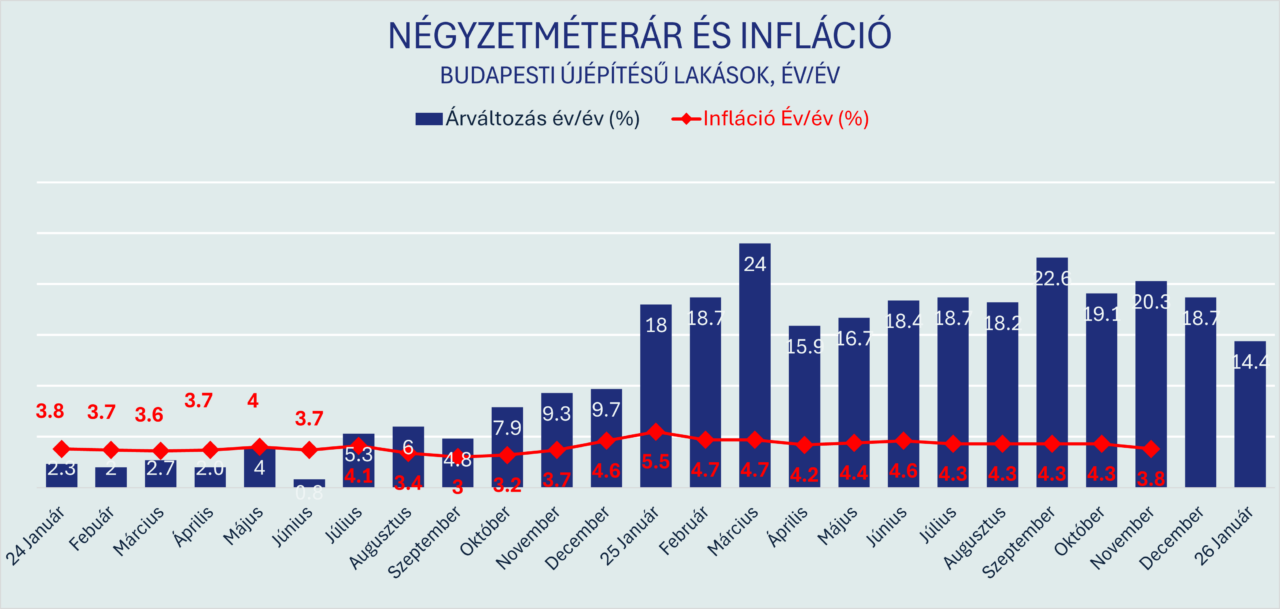 A 2025-ös év egyértelmű töréspontot jelentett az infláció és az újépítésű lakások áralakulása között. Miközben a pénzromlás üteme az év nagy részében már 3–5 százalék körül mozgott, az új lakások négyzetméterárai sok hónapban 20 százalékot meghaladó éves növekedést mutattak.