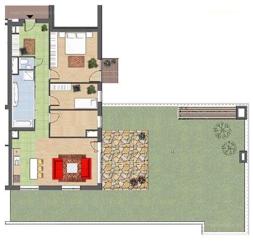 És persze a lényeg: kényelmes tetőterasz és hatalmas saját tetőkert, japánkert stílusban, csepegtetéses öntözőrendszerrel, örökzöldekkel várja az új tulajdonosokat.