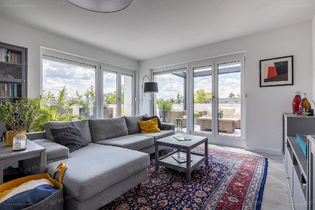 “[…] Az ingatlan egy csendes, modern lakópark legfelső lakása, egyedüli lakásként a szinten. A hatalmas ablakok és teraszajtók által természetközeli érzés, sok zöldfelülettel. A lakásba belépve az előszobába érkezünk. Balra található 2 hálószoba, a kádas fürdőszoba és a külön wc. Jobbra találjuk a hatalmas étkezős nappalit, és egy hálószobát, melyhez wc-s fürdőszoba tartozik. A különálló wc kivételével minden helyiség ablakos, világos! A konyha teljesen beépített, rengeteg tárolási lehetőséggel felszerve. Beépítve: hűtő mikró mosogatógép grill funkciós sütő Electrolux főzőlap A lakáshoz 2 parkoló tartozik a társasház kerítéssel elzárt területén, illetve egy kialakításra váró padlástér is az ingatlan része. Ezek mind a vételi ár részei!