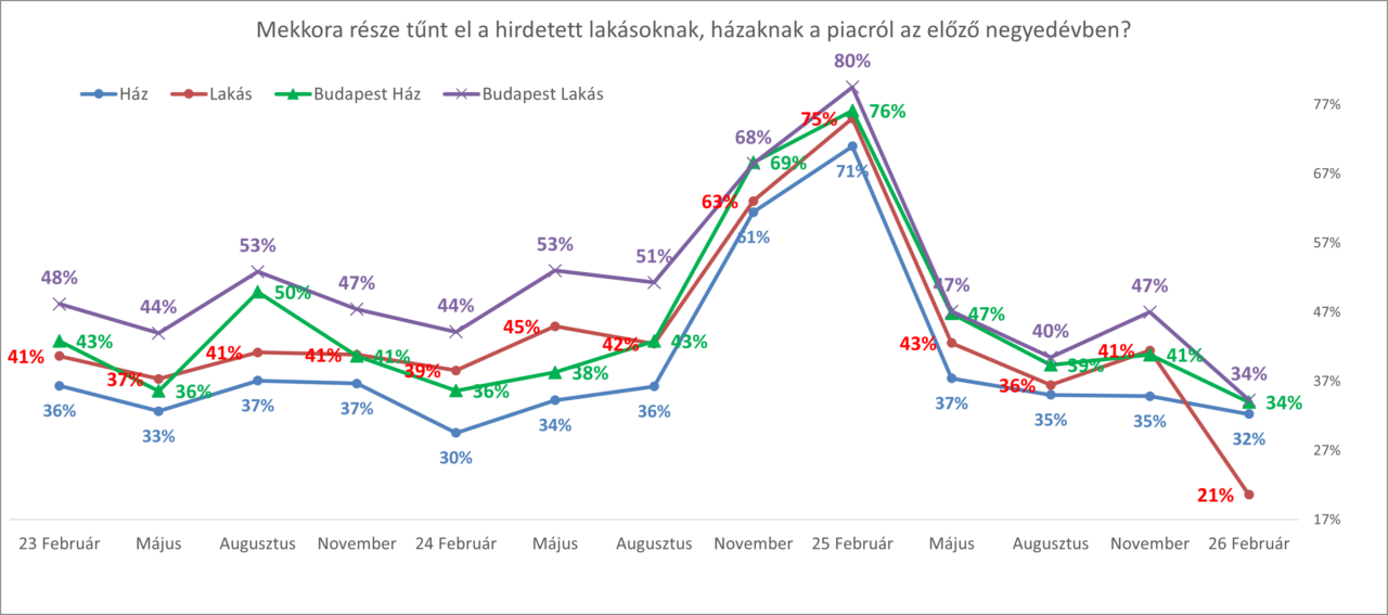 • Lakások esetében a három hónapon belül eltűnő hirdetések aránya 37 és 45 százalék között mozgott.