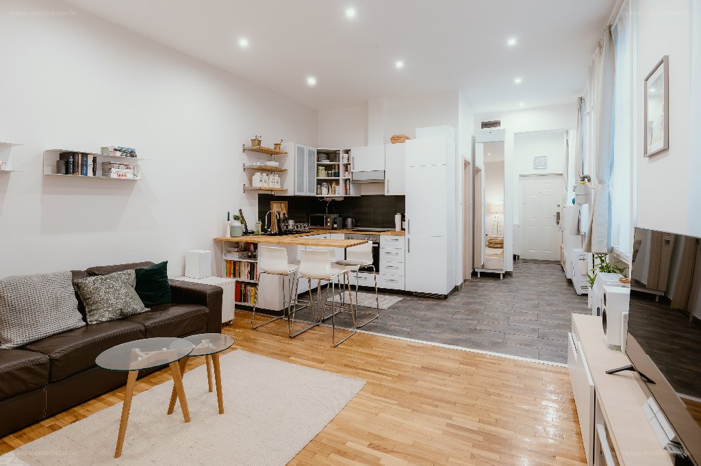 Az elmúlt években teljes körűen felújított lakásban egy amerikai konyhás nappali, egy tágas hálószoba, gardrób szoba, fürdőszoba valamint egy mosdó került kialakításra.