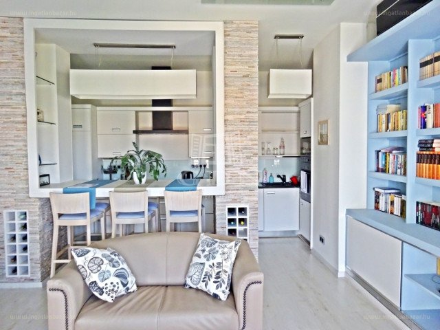 A beépített gépesített konyha, és a képeken látható összes bútor az ár részét képezi (a függönyöktől a terasz napozóágyakig, Bosch konyhagép,mosógépek,hűtök,redőnyök, az egy éves ülőgarnitúrától a bárszékekig, minden marad). Az ingatlanban minden egyedileg mérhető, a lakás fűtését és meleg vizét házközponti kazán biztosítja ,mely egyedi mérőórával felszerelt.”