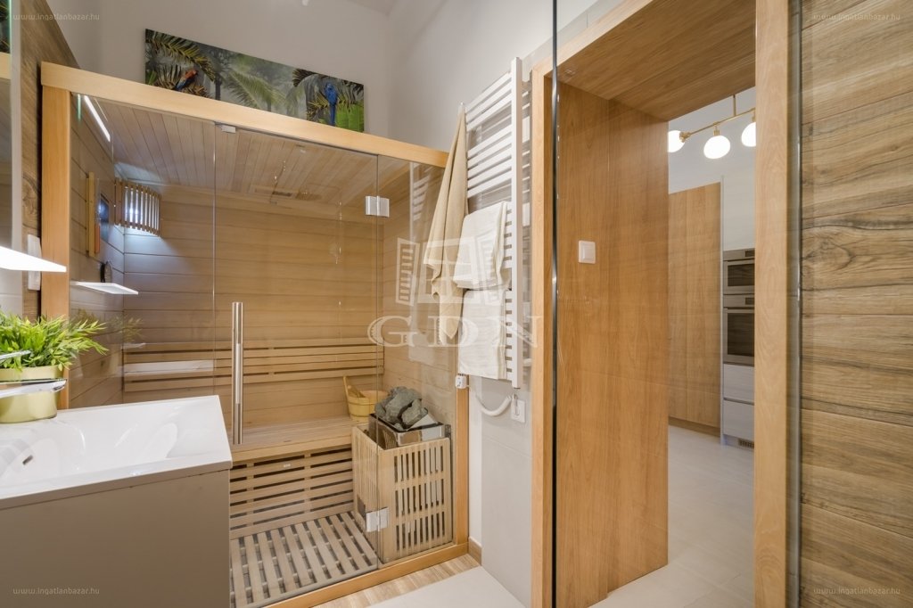 Extrák: Bioetanol kandallók, finn szauna, szaunás fürdőben okos tükör (zenét lehet hallgatni, fényerőt állítani), elektromos redőnyök, bidés wc, okos ledek és okos világítás ami telefonról, beszéddel szabályozható az egész lakásban. A wifis klíma, szintén telefonról vezérelhető. Egyedileg gyártott belső nyílászárók, tölgy parketta, minőségi burkolatok kerültek beépítésre. […]”