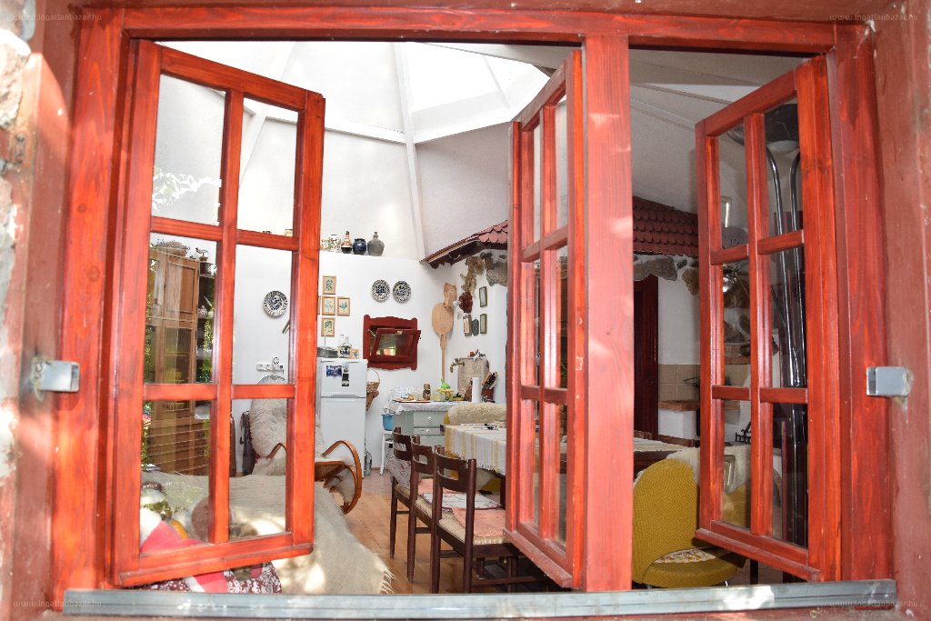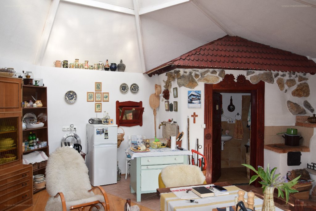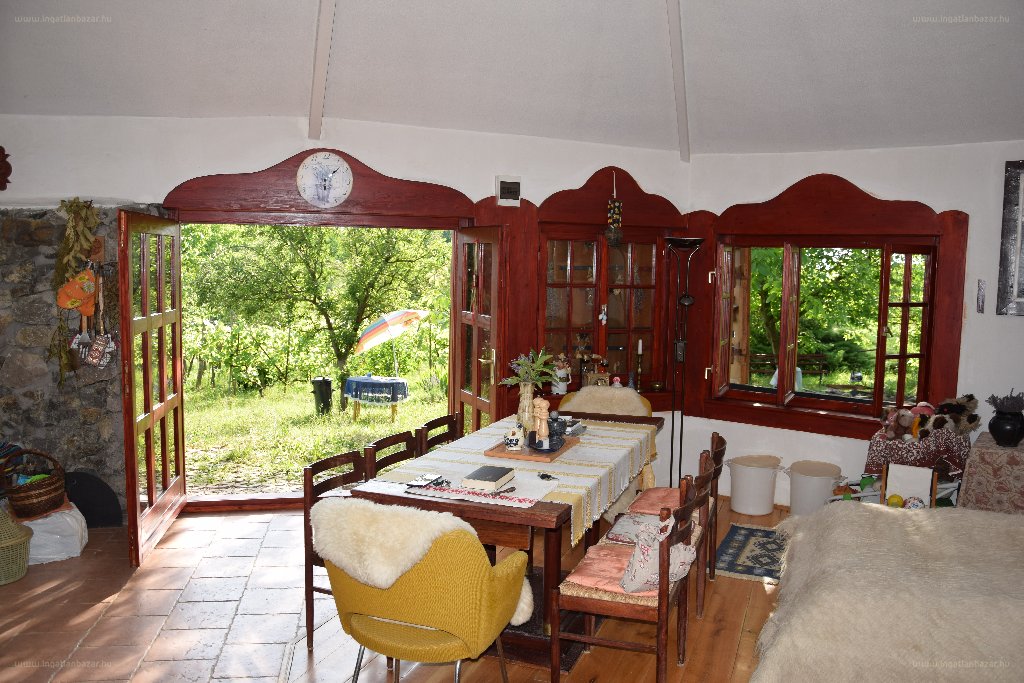 A 2442 m2 telken egy 35 m2, hétszögletű fénygyűjtő kupolával épített házikó, egy vendégház (10m2) és egy pince (20 m2) kapott helyet. A Komlón épült ingatlan 500-600 méterre található a főúttól, kavicsos úton télen is jól megközelíthető. A telken számos gyümölcsfa, dísznövény megtalálható ( szilva, alma, dió, mogyoró, szeder, füge, szőlő, cseresznye, meggy, körte, kajszi, őszibarack). Villany mindkét épületbe bekötésre került, vízhálózat jó hozamú kútról üzemel. Csatorna nincs, emésztő üzemel. A szomszédoktól jól elszeparált ingatlan, az erdő az igazi szomszéd. Bolt, orvos, gyógyszertár 1-2 km közelségben.”