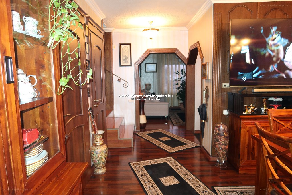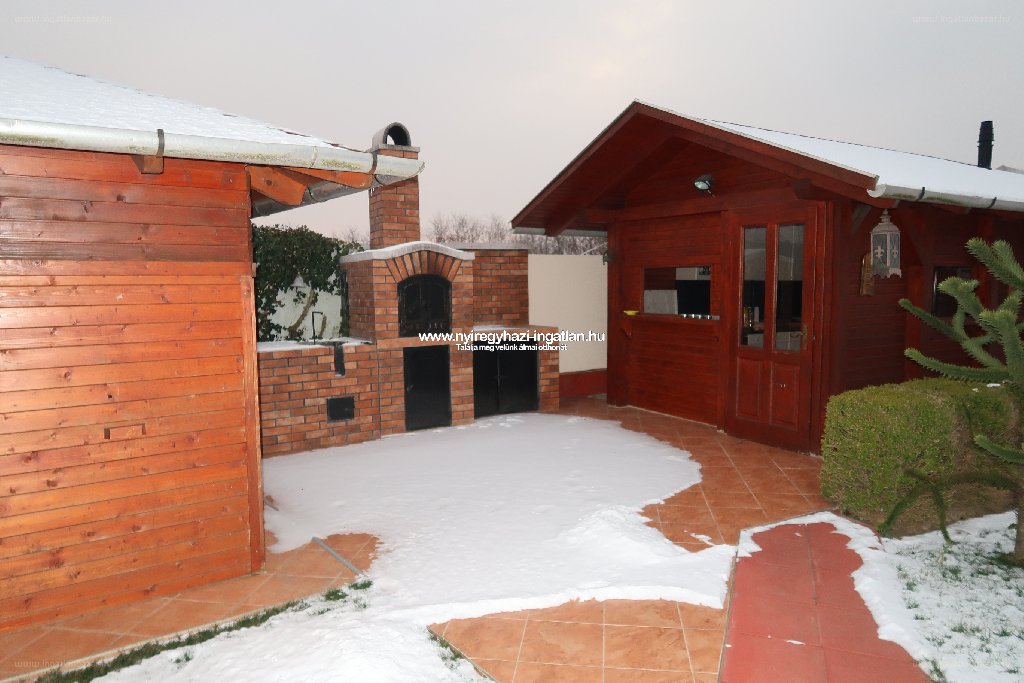 “Kiváló vétel! Nyíregyházától pár percre magas minőségű 130 nm-es, 3 szoba + étkező, nappalis luxus családi ház 1438 nm-es gyönyörűen parkosított telken eladó. A ház alsó részében helyezkedik el egy tágas társalgó, mosókonyha, szauna, borospince. Az alagsorból lépcsőn juthatunk fel a földszinti részre. Az épület földszintjén nagy étkező, konyha, spájz található gyönyörű fa burkolatokkal, világos nappalival és szülői hálószobával. Fürdőszobában tágas épített zuhanyzó, két mosdóval, külön wc- vel. Az emeleti lakótérbe érve egy tágas közlekedő fogad, melyből egy fürdőszoba, kettő hálószoba nyílik. Az egyik hálószoba erkélyes.