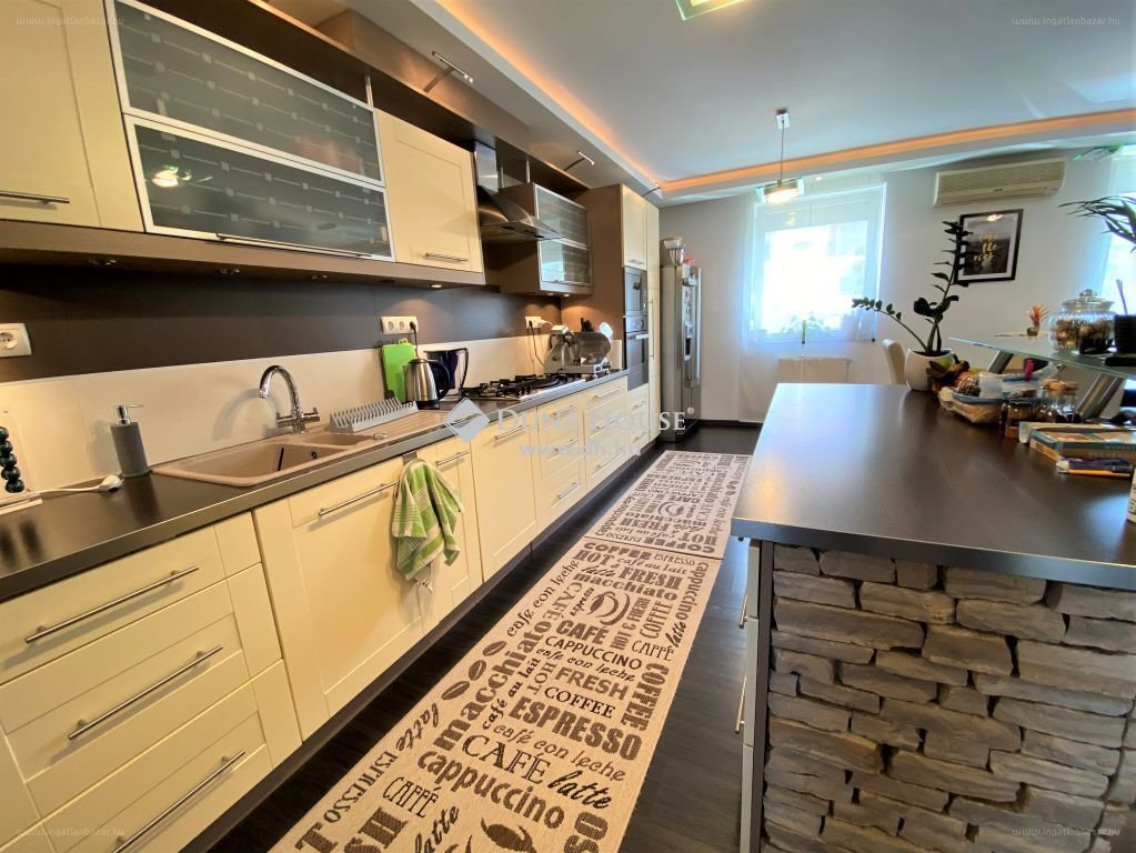 A belső kétszintes lakásban műanyag, hőszigetelt üvegezésű ablakok kerültek beépítésre, a bejárati ajtó több ponton záródó fa szerkezetű, a beltéri ajtók szintén fából készültek. A nappali – konyha – étkező és a szobák szalagparkettával lettek burkolva, fürdőszobák burkolata kerámialappal történt. A fűtés és a melegvíz ellátás kombi gázkazánról történik. Mind az emeleten, mind a tetőtérben klíma berendezés került felszerelésre, amely az összes helyiség hűtését megoldja. A házban központi vízlágyító berendezés működik. A társasház körbekerített, zárt lakóparkban helyezkedik el. A lakáshoz tartozik egy 17 nm-es önálló garázs, amely a lépcsőházból is megközelíthető. […]”