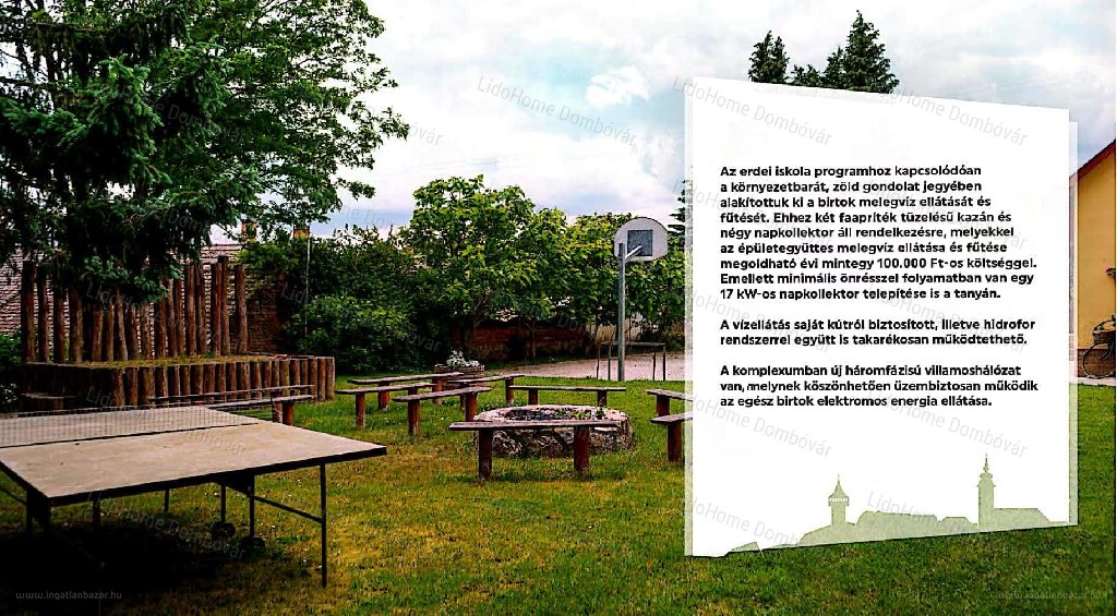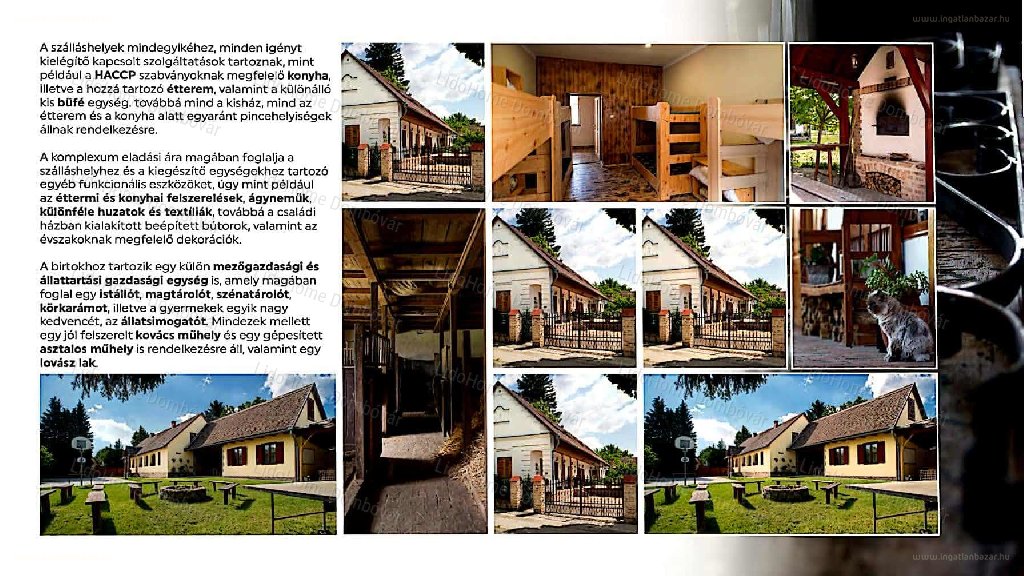 A gazdasági egységekben található istálló, szénatároló, felszerelt kovácsműhely. A fűtést fa aprítékkal működő kazán biztosítja. Az energiaellátást segítik a felszerelt napkollektorok, és a bevezetett 3 fázisú elektromos áram. Hidrofor rendszerrel működő saját kút is rendelkezésre áll a birtokon. Az eladási ár magába foglalja a teljes berendezést. […]”