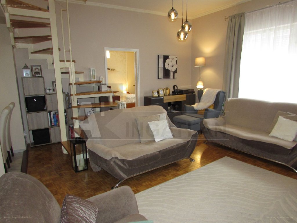 - lakás , belső kétszintes : 1. emelet :72 m2-es , előtér , egybe nyitott étkező , tágas napfényes nappali / innen vezet fel a lépcső az emeleti szintre is / , szülői háló , közvetlen kapcsolattal a sarokkádas fürdőszobával , a konyha étkezőből nyílik , ajtóval elválasztva.