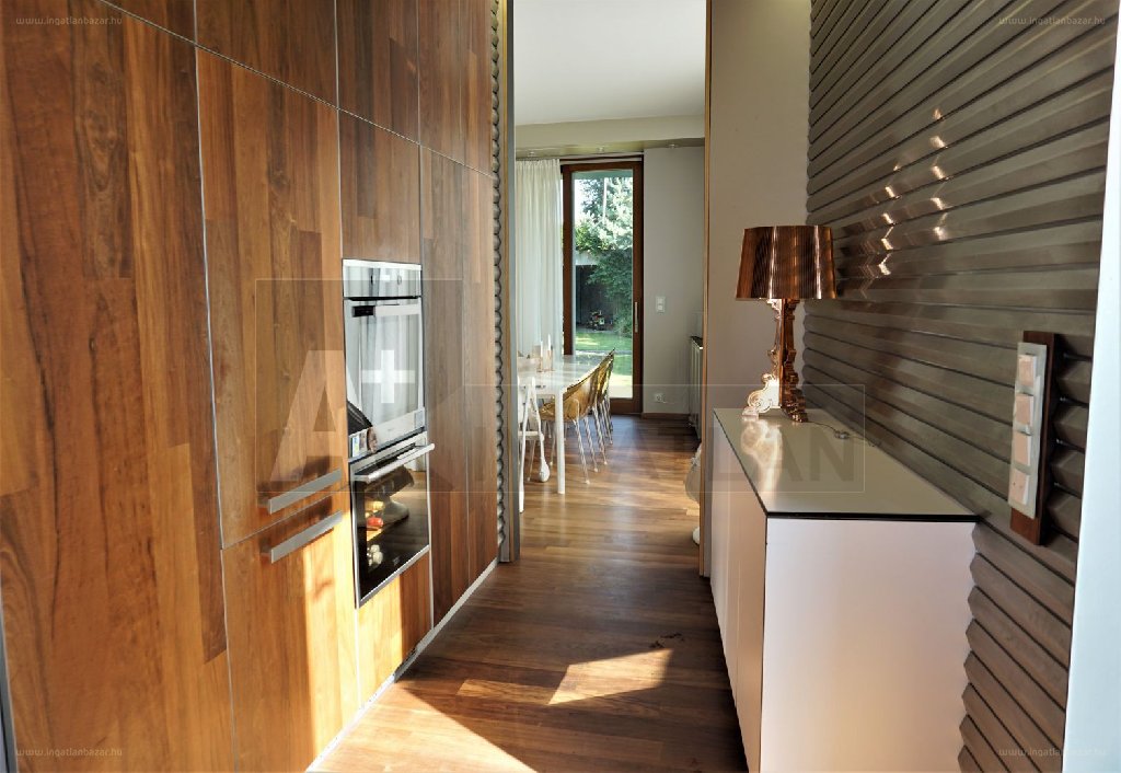 “Minden szoba igazi fapadlóburkolattal ellátott. Az otthon egyik különlegessége a földszinten található folyosó végén lévő nyíló felület burkolata,mely egy élő zuzmópanel ami nem igényel gondozást a lakás megfelelő páratartalma miatt. A konyha minimalista stílusú de maximális térkihasználású. A konyhai munkafolyamatok optimalizálása miatt a neves Bulthaup konyhák mintájára készült.