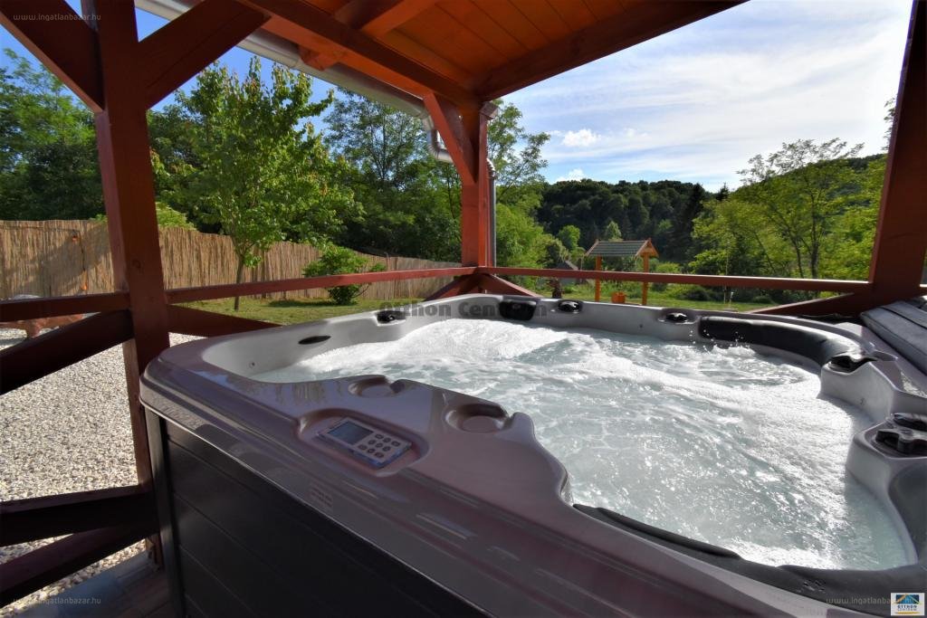– A házakhoz tartozik egy 20 m2 és egy 30 m2-es fedett terasz, melyen egy-egy 5 személyes prémium deluxe jakuzzi medence található. Ezek a ház tartozékai. Az egyedi, stílusos teraszbútorzat tovább fokozza a kikapcsolódás élményét.