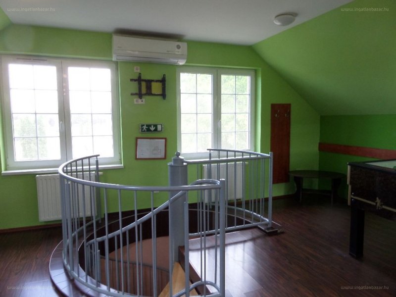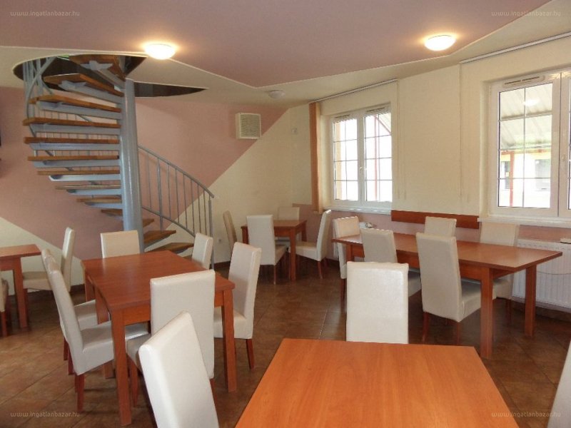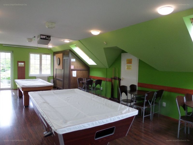 A földszinten a pizzéria, kiszolgáló helyiségek és a Bowling terem kapott helyet. A tetőtérben egy biliárdterem működik a tetőtér Bowling terem feletti részén akár szobák kialakítására is lehetőség van akár ráépítéssel is. A földszint 344 m2 amelyből a Bowling Pálya 239 m2 egyéb helyiségek, ügyféltér 105 m2 a beépített tetőtér nettó 64 m2 összesen 408 m2 alapterülettel rendelkező részből áll a fűtést gáz cirkó rendszer biztosítja az egész épületben.