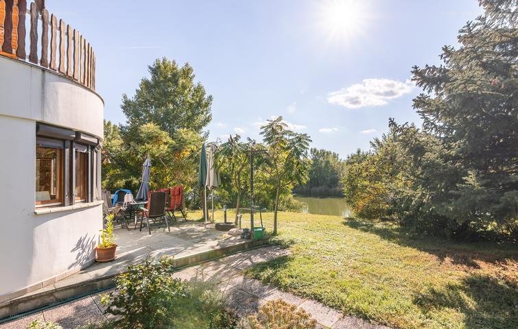 „A víz felőli udvarrész füvesített és a bejárat térkövezett a kert gondozott. A tóból történő locsolás is engedélyezett. A kert tó felőli részén a terasz lépcsőzetesen kialakított. A ház összes szobája rendelkezik önálló, saját terasszal, mind a földszinten, mind az emeleten, a tó vagy az utcafront felé . A bejáratnál 2 gépkocsi parkolásra alkalmas beálló található. […]”