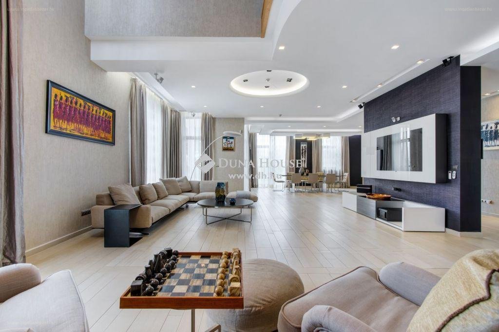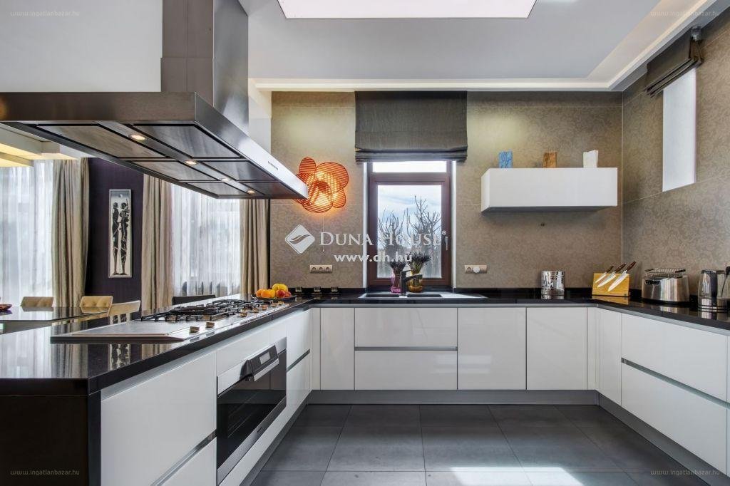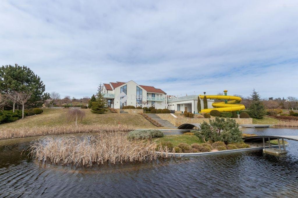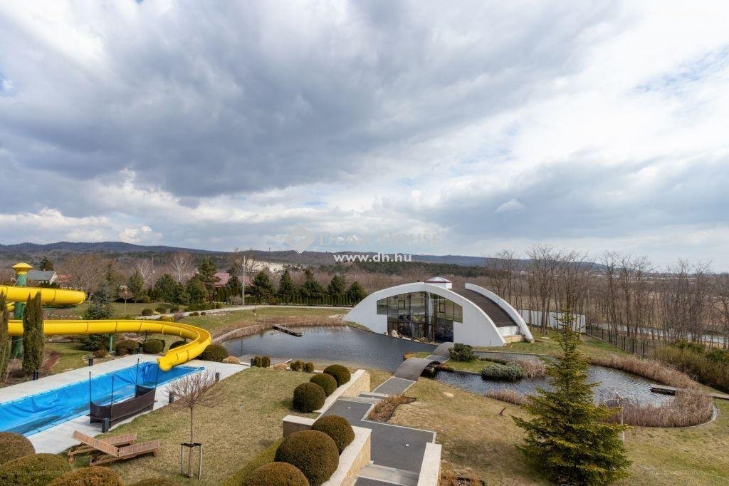 A kertnek több érdekes eleme van, egyik ezek közül egy impozáns méretű, víztisztító rendszerrel is ellátott mesterséges tó. A másik különlegesség a fűthető, világító, ellenáramoltató rendszerrel, önműködő tetővel, valamint a család legkisebb tagjainak örömére egy igazi AQUAPARK-csúszdával is ellátott úszómedence.A kert szépségéről a szabályozható automatikus öntözőrendszer gondoskodik, a gyümölcs- és díszfák öntözése saját kútból, valamint egy 50 köbméteres víztározóból történik.A ház és a kert organikus kapcsolatát a különböző szinteken található teraszok nyújtják. Ezek között találunk egy hatalmas, panorámás kilátó teraszt jakuzzival, de egy kültéri olasz tűzhellyel ellátott komplett grill-konyhát is, tágas térrel és komplett felszereléssel! A teraszok mindegyike luxus minőségű, 5 csillagos hotelekben használt DEDON márkájú kerti bútorokkal és napozóágyakkal berendezve kerül értékesítésre.A birtok főépületének mérete a hatalmas teraszok és erkélyek nélkül is meghaladja a 600 négyzetmétert. […]”