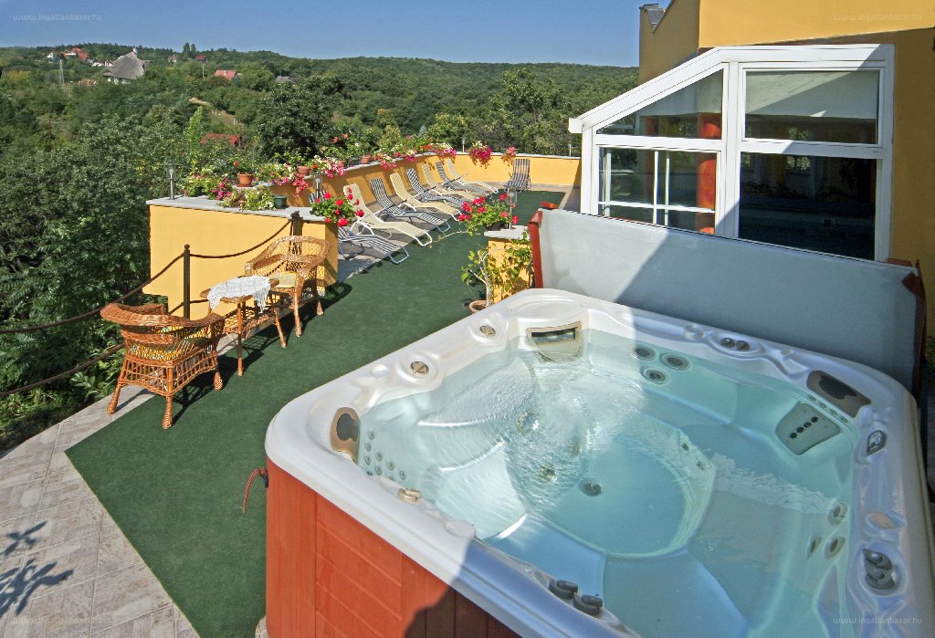 „Festői környezetben Velencei tóra panorámás wellness hotelnek is alkalmas villa! […] Az épület 1989 és 1994 között épült példátlan igényességgel, egyedi megoldásokkal, időtálló klasszikus stílusban és technológiával, az egyedi és különleges adottságú telek tulajdonságainak tudatos kihasználásával. Két épületszárnyra tagolt, ennek köszönhetően két különálló épületként is funkcionálhat, akár ketté is osztható.