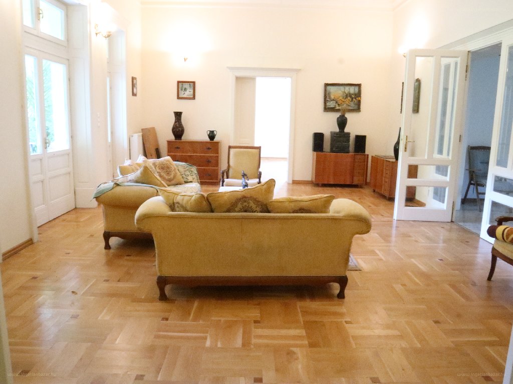 A földszint tágas terekből áll össze, mely magas, nagyméretű ablakokkal határolt, belmagassága 3,65m, körbenapozott, így kellemes, világos, szellős miliőt biztosít reggeltől, estig. A nappali ideális méretű, 41m2, ahonnét a biliárd szoba, valamint a keleti terasz közelíthető meg, mely nyáron a délutáni órákban kellemes, hűs időtöltésre ad lehetőséget, kilátással az ősfás parkra. Ezen a szinten, egyebek mellett, helyet kapott még kettő hálószoba, melyekhez saját fürdő tartozik és egy 24 m2-es étkező, amihez a nyugati oldali terasz és asztalos által, egyedileg, keményfából gyártott konyhabútorral felszerelt, gépesített konyha kapcsolódik.