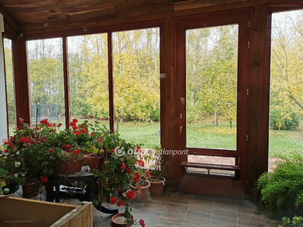 A ház kialakítása: 3 külön álló szoba, nappali, konyha-étkező, kamra, fürdőszoba, mosókonyha, wc , télikert, valamint a tetőtérben egy 50 m2-es nappali, egy gardrób helyiség, illetve egy fedett terasz is, amely igény esetén akár további helyiségekkel bővíthető, külön álló lakrésszé alakítható. A bejáratnál 44m2 , a hátsó oldalnál 36 m2 terasz kapcsolatos. A 90 m2-es szigetelt melléképületben, 2 autó részére garázs, vendégfogadó helyiség búbos kemencével, borospince, műhely és egy fedett terasz található. Az épület 38-as Porothon téglából épült, a ház homlokzata 8 cm EPS hőszigetelő rendszerrel, a födém 30 cm kőzetgyapottal szigetelt. A nyílászárói fából készültek hőszigetelt üvegezéssel az ablakokat hőszigetelt alu redőnyök védik. Fűtése, a konyhai részben elhelyezett vízteres (sütővel kombinált) cserépkályhával üzemelő padlófűtés. A meleg vizet villanybojler biztosítja.