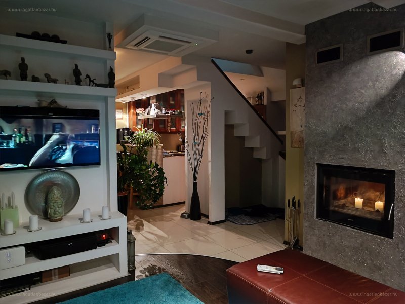 A lakásban alkalmazott meleg földszínek keverve a matt ezüst és bronz árnyalataival, végtelenül elegánssá és otthonossá varázsolták a helyiségeket. Mindez a jelenlegi tulajdonos remek ízlését dicséri. A lakás alsó szintjén (melynek alapterülete 94 nm) egy amerikai konyhás nappali étkezővel, egy fürdőszoba, egy tárolóhelyiség (mosógéppel) és két tágas hálószoba került elhelyezésre, a tetőtérben pedig – a ház teljes hosszában – egy légtérben, de mégis elkülönülten egy hálószoba és zuhanyzós fürdőszoba található. A lakás fűtését hőszivattyús klíma biztosítja (amelyet, ha a lakás új tulajdonosa kiegészít H tarifával, még gazdaságosabb rezsit eredményez). A földszinten a nappaliban egy fafűtéses kandalló is helyet kapott. (gáz a ház alsó szintjén bevezetve)