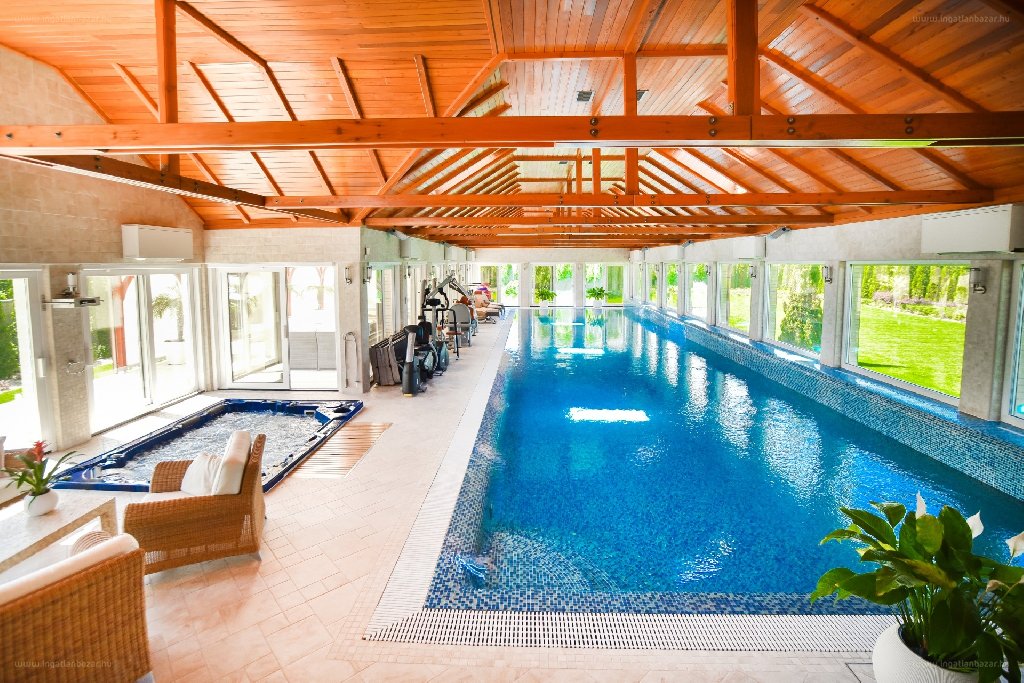 Az orosházi házhoz wellness részleg is tartozik, a maga 5×20 méteres, automatizált beltéri medencéjével, mely rendelkezik ellen-áramoltatóval is. Fedését távirányítással oldhatjuk meg. A medence mellett kapott helyet egy tízszemélyes jacuzzi, egy nyolcszemélyes finn szauna, továbbá a barnulni vágyóknak csúcstechnológiájú szolárium és egy minden igényt kielégítő, extrán és igazán minőségi gépekkel felszerelt fitneszterem. Az uszoda tér ajtói automatán nyílnak. Az előtte elterülő terasz árnyékolását is automatikus rendszer irányítja. A gyönyörűen ápolt kert gondozásáról automata fűnyíró robot is gondoskodik. Természetesen az öntözés is automatizált, előre programozott metódus szerinti intervallumokkal, vagy akár mobiltelefonról direktben is indíthatóan. A nappalihoz csatlakozó terasz üvegtetővel és automatizált árnyékolástechnikával ellátott. Az ingatlan komplett videós riasztórendszerrel, távfelügyeleti ellenőrzéssel ellátott. A világ bármely pontjáról irányítható intelligens rendszerrel rendelkezik, amivel minden elektromos eszköz elérhető. […]”