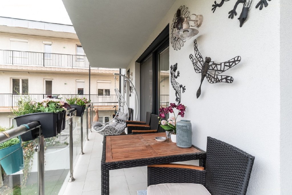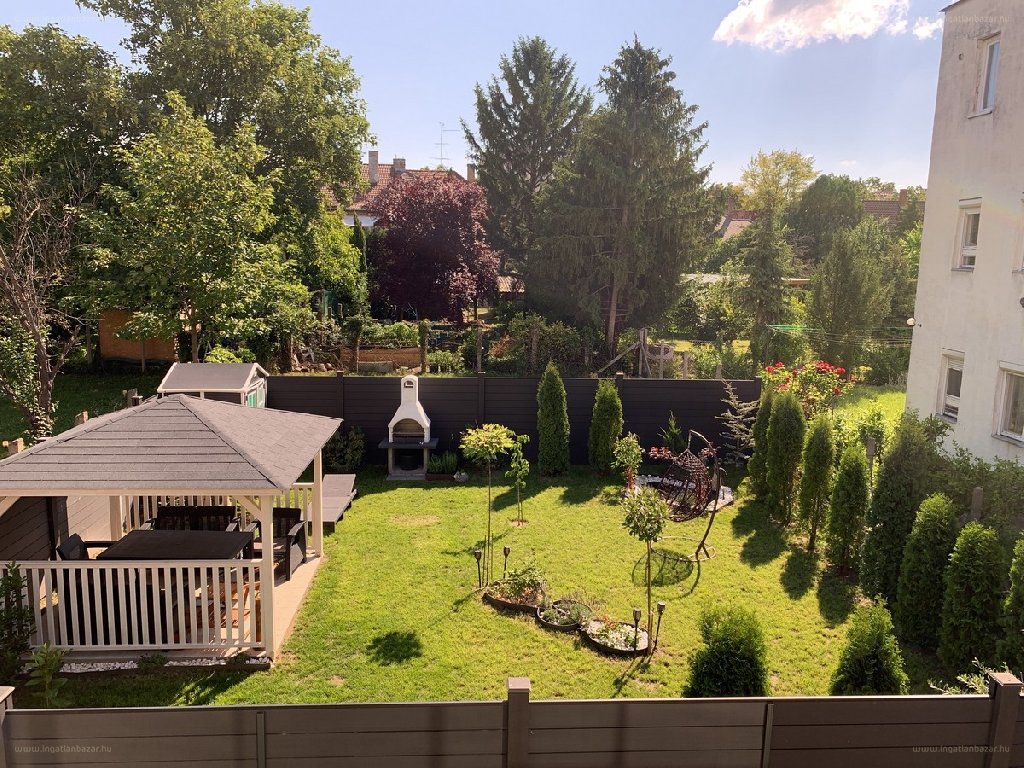 A három lakásos társasház első emeletén elhelyezkedő 100 m2-es lakóterülettel rendelkező lakáshoz, tartozik egy kertre néző 10 m2-es erkély, egy 17 m2-es önálló garázs, egy 6 m2-es tároló és a garázs előtti gépkocsi beálló, valamint 160 m2 parkosított kert, ahol filagória, kerti tároló és egy kerti tó is található. A nappali plusz három szoba fő funkció mellett a minden napos komfort érzetet növelően két fürdőszoba, kamra, háztartási helyiség is a lakás része.