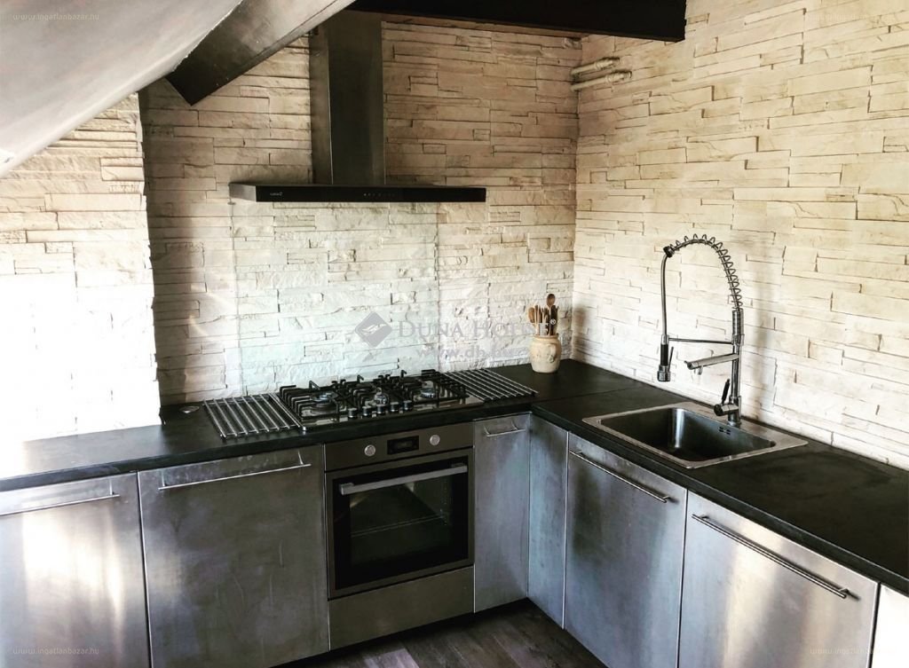 Konyha : Ipari-Minimal stílusban átépítve, tágas, konyhabútor egyedi szálcsiszolt inox burkolatokkal készítve, gépesítve. Wok-os extra széles + elektromos légkeveréses sütő, elszívó.