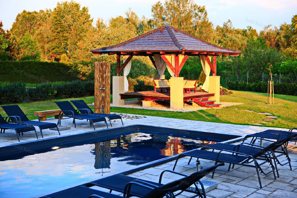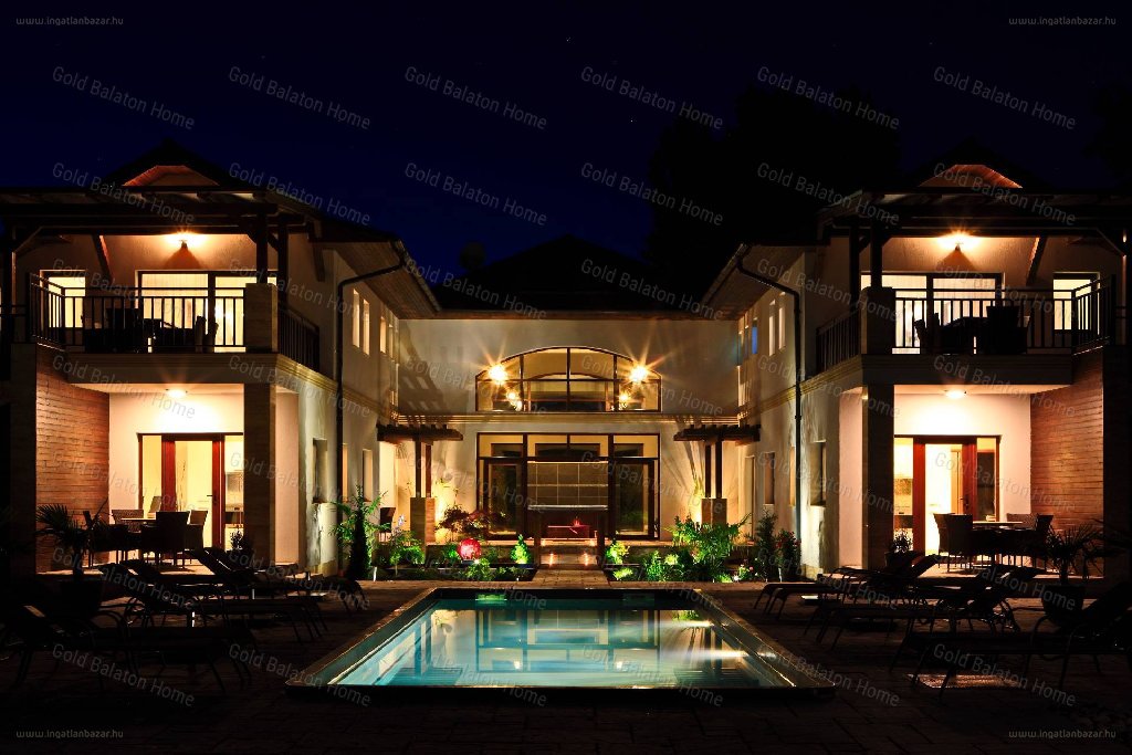 Egy ikerházrész lakótere kettő szinten 255 m2, melyhez 945 m2 telekrész jut. Újszerű állapotba van az igényesen megépített ikerház, ami bútorozottan eladó. A keleti stílusban épült ház kétszintes és két egyforma épületszárnyból áll. Belső wellness tér kapcsolja össze az épületszárnyakat. Minőségi anyagokból épült ház, mely külső medencével, belső wellness részleggel kínál testi, lelki felüdülést. A kertet különleges növények kompozíciója, kis kerti tó, esti világítás ékesíti. Családi háznak, nyaralónak is jó választás! […] A Gyenesdiási strand különösen kedvelt, amely a keleti stílusú villától 900 m-re található. A villa szomszédságában a gyenesdiási kalandpark, kerékpárút. […]”