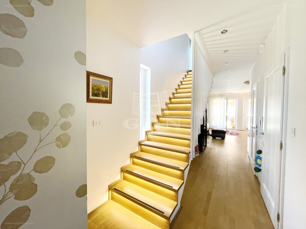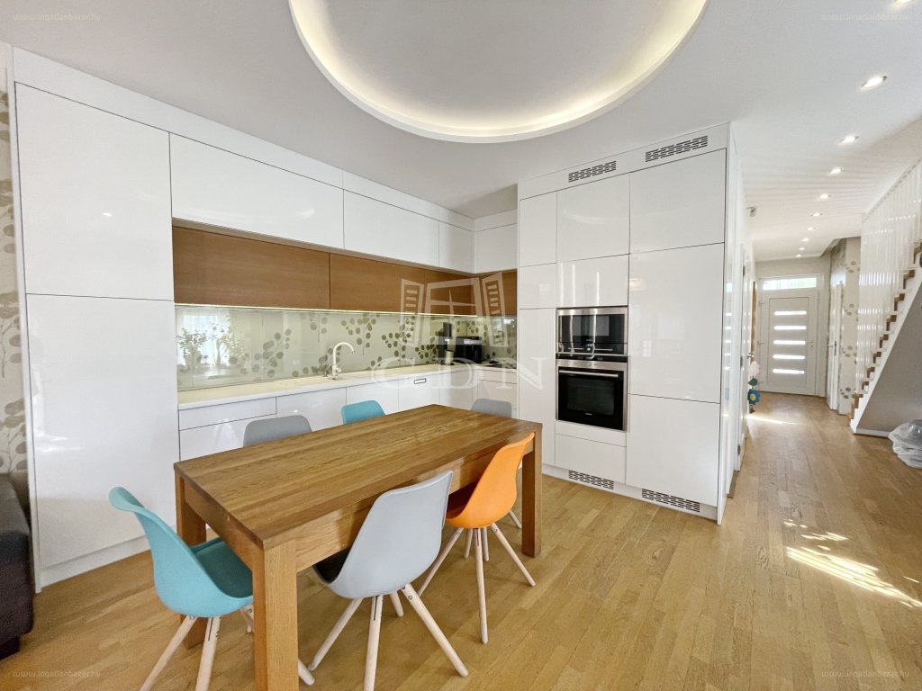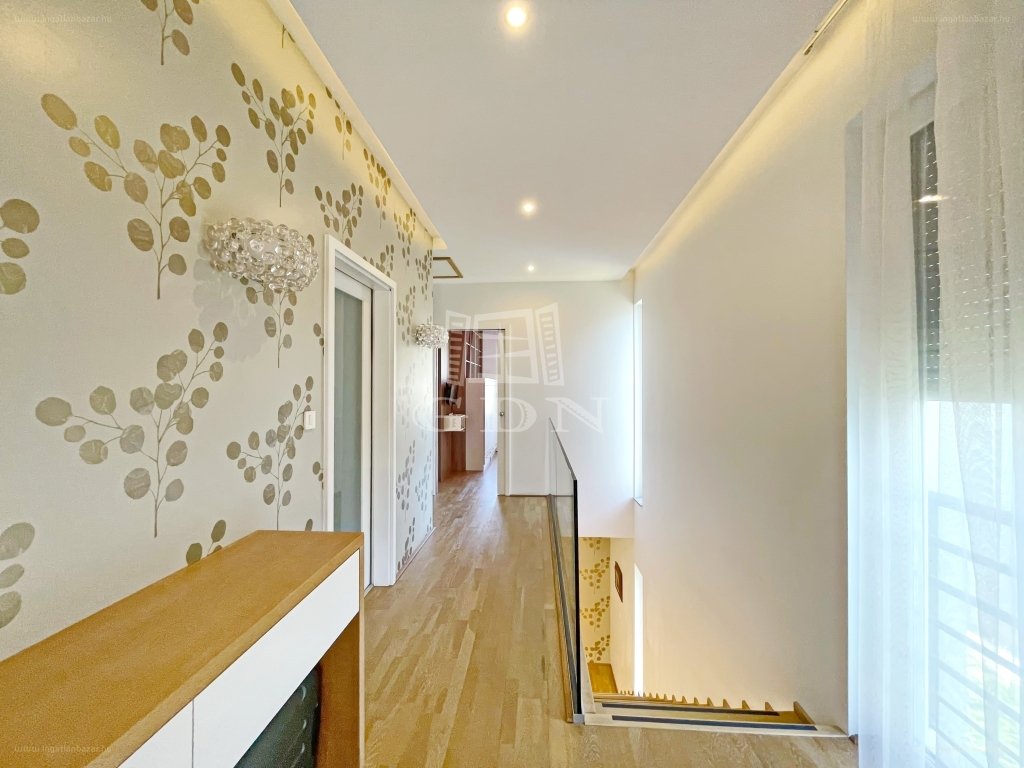 “Debrecen, a Lovas Akadémia közelében, felső kategóriás lakóparkban, 2014- ben a kor műszaki és esztétikai jegyeinek felhasználásával épült, kétszintes, nappali- amerikai konyha + 3 hálószobás, 138 m2 alapterületű, dupla komfortos, intim, 16 m2 fedett terasszal rendelkező szélső sorház, élhető – karban tartható 330 m2 telekkel, kültéri konyhával, tárolóval is felszerelve eladó. Az ingatlan klimatizált (3 db), szaunával, riasztóval, elektromos redőnyökkel, 18 m2 garázzsal, 10 m2 padlástéri gardróbbal, fúrt kúttal, kerti öntözővel, búbos kemencével kiegészített kültéri konyhával, 2 autónak parkolási lehetőséggel rendelkezik. Fűtése egységesen padlófűtés, a homlokzat hőszigetelt, mivel K.- Ny. -i tájolású és D.-i tűzfallal rendelkező szélső épület rész, így gazdaságosan fenntartható. […]”