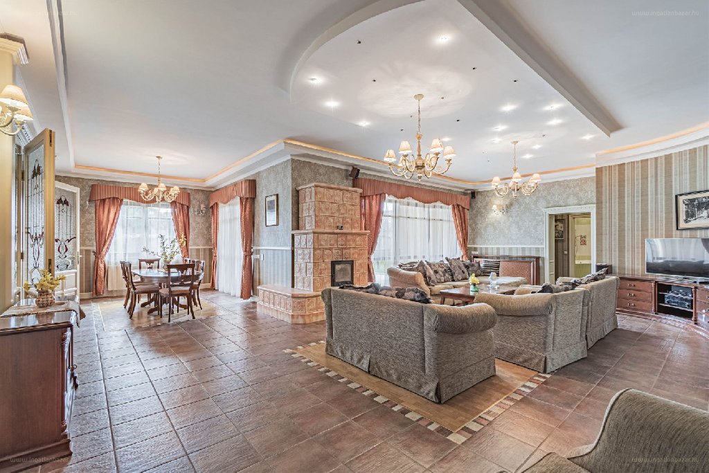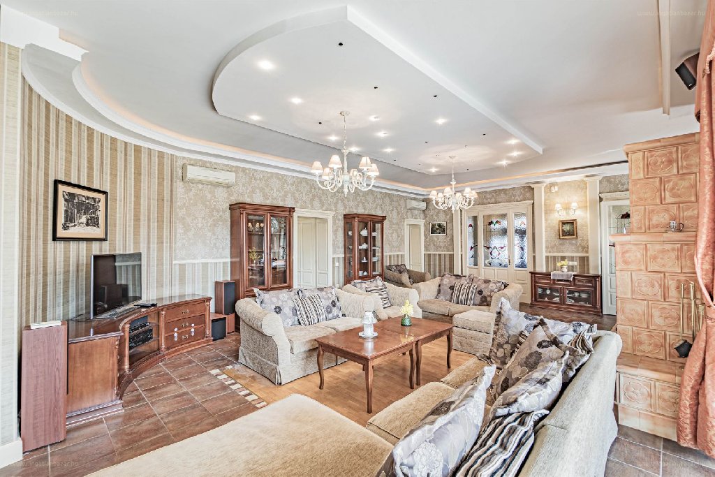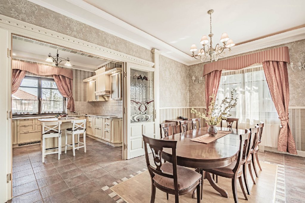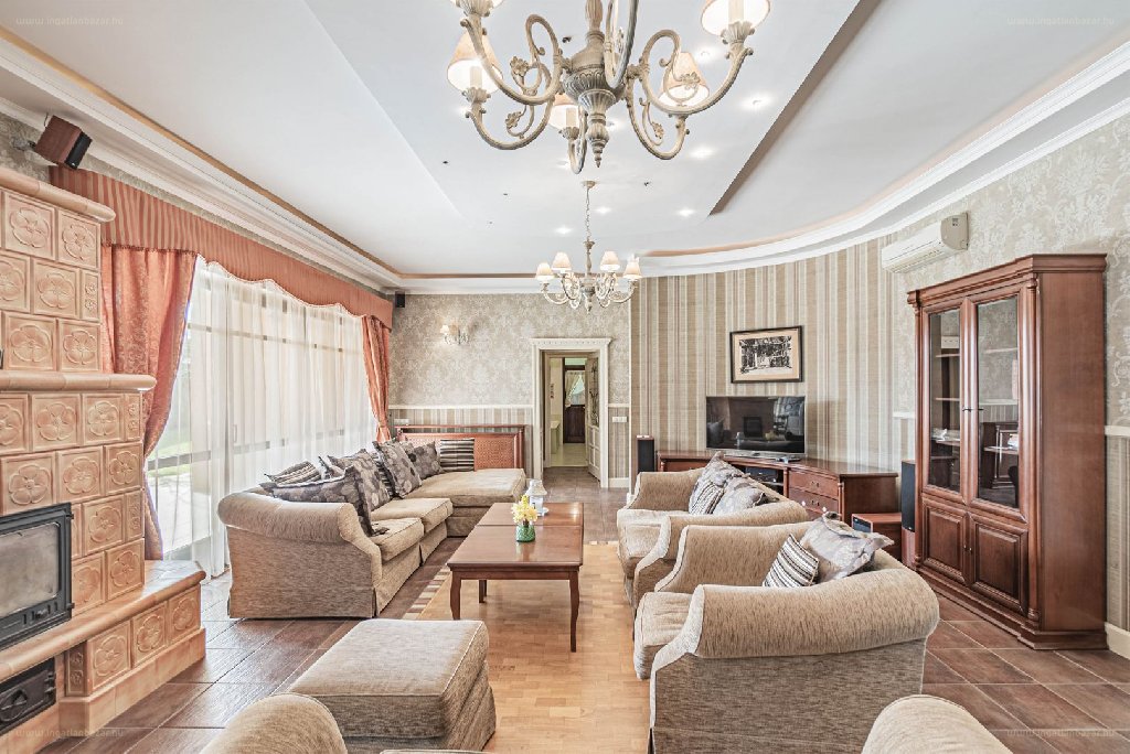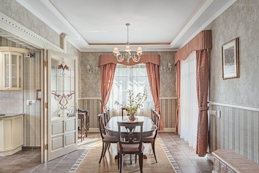 Az egyedi tervezésű, fából készült nyílászárók, valamint a falakon található drapériák, tapéták és a különleges lámpacsalád kifinomult ízlésűek, klasszikusan berendezett otthont biztosítanak.